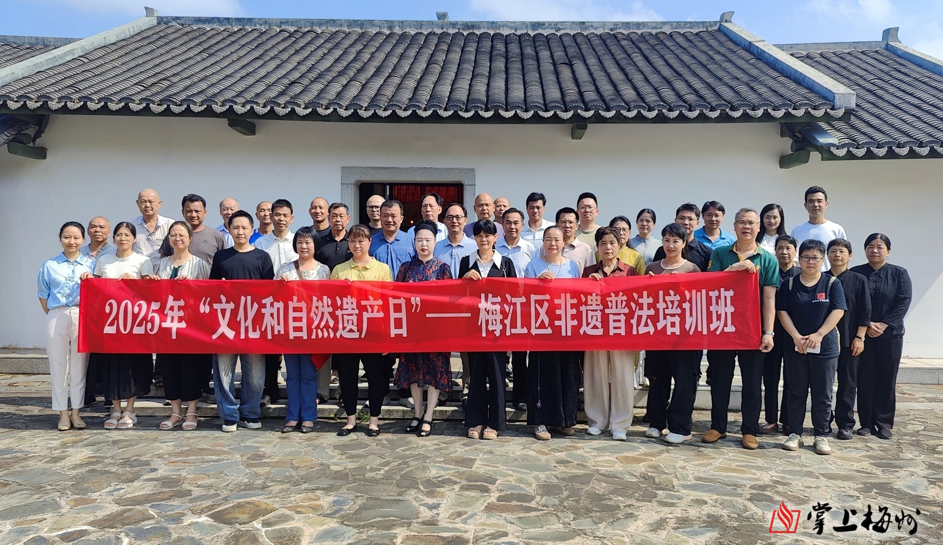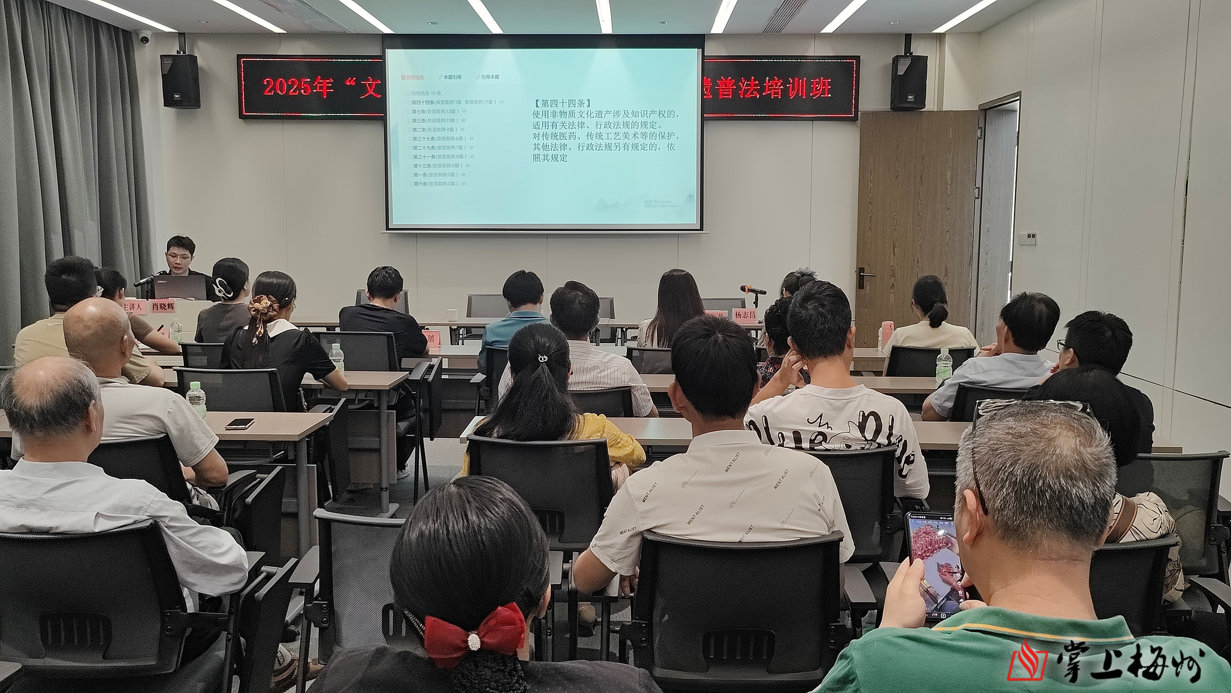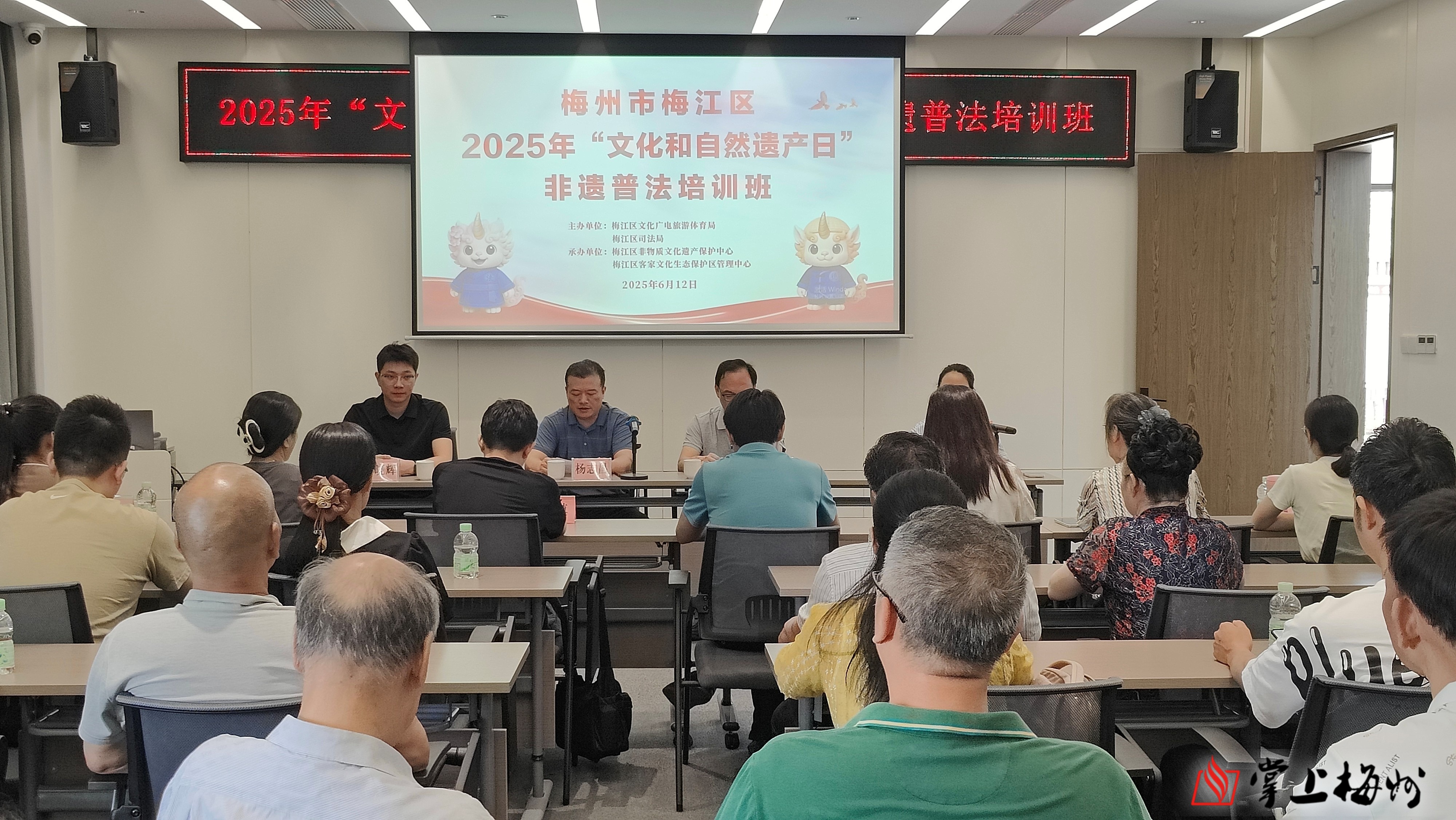 掌上梅州讯 6月12日上午,由梅江区文化广电旅游体育局与梅江区司法局主办,梅江区非物质文化遗产保护中心与梅江区客家文化生态保护区管理中心承办的“文化和自然遗产日”非遗普法培训班在熊锐故居展陈馆举行。各镇(街道)非遗负责人、各级非遗传承人及项目保护单位代表参加活动,共同探索法治赋能非遗保护的新路径,为客家文化(梅州)生态保护区建设注入新动能。