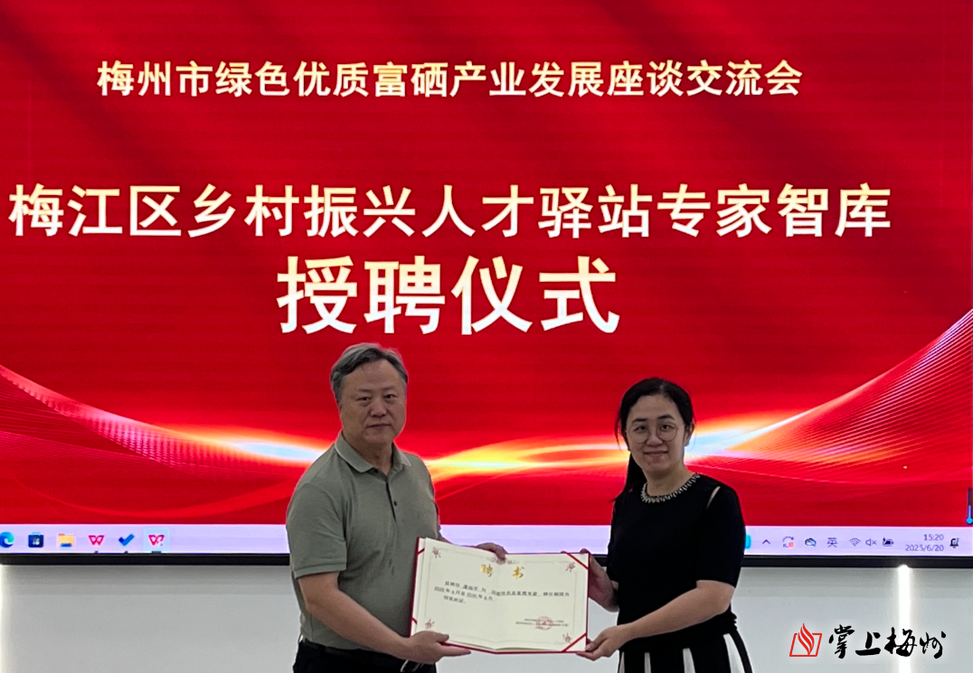 会上,梅江区委组织部常务副部长宋鹏鸿向潘灿平院士颁发聘书,正式聘请其担任梅江区乡村振兴人才驿站“功能性农业智库首席专家”。宋鹏鸿对潘灿平的到来表示欢迎与感谢,并希望他能更深入地参与梅江区涉农产业,特别是功能性农业与富硒产业的高质量发展,提供持续智力支持。