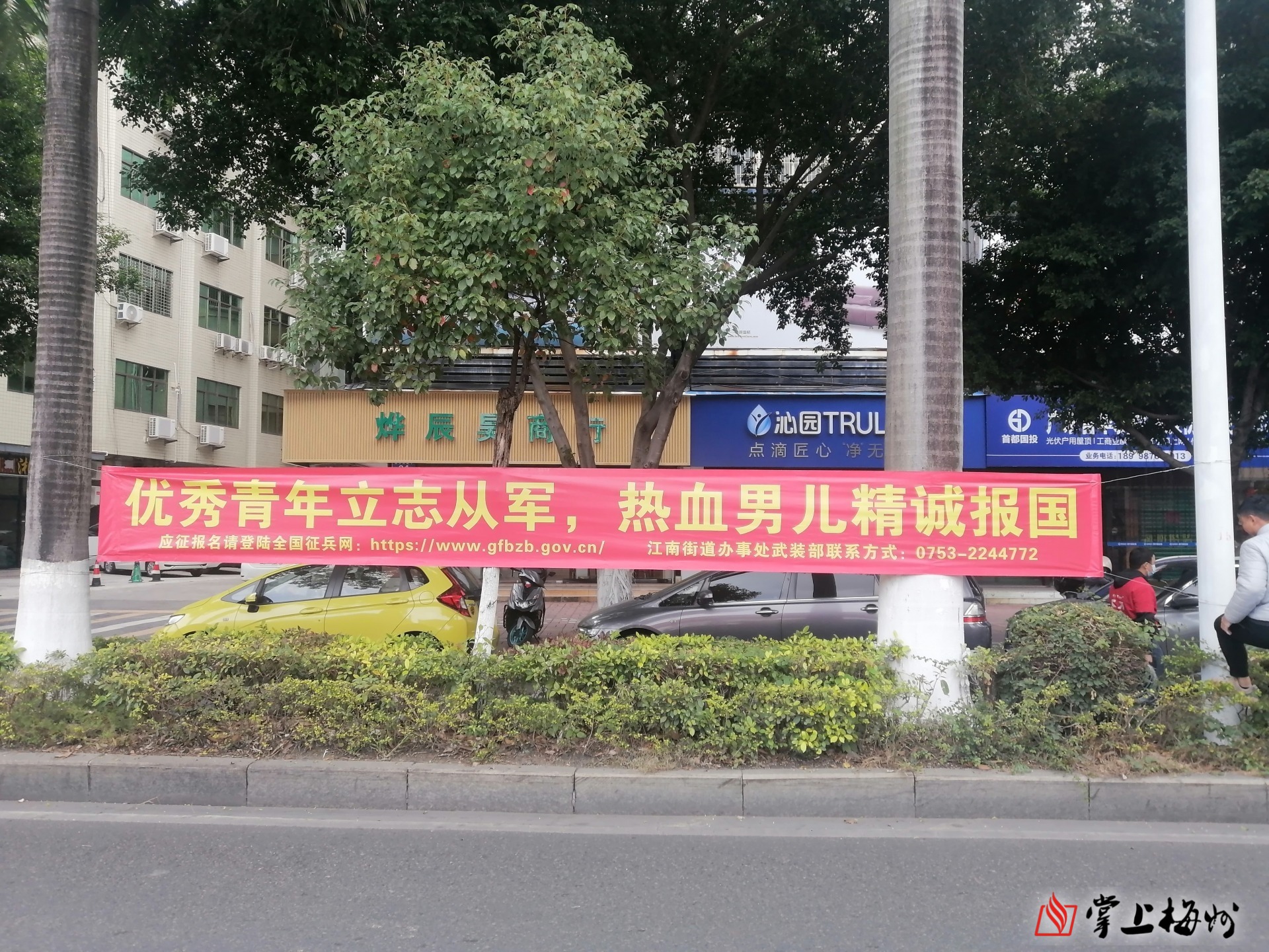 为扩大宣传覆盖面,通过“线上+线下”全覆盖方式、深入解读参军优待政策、大力宣扬梅江区现役、退役军人优秀典型,激发广大青年报名参军热情,在辖区营造崇军尚武、参军报国的浓厚社会氛围。线上利用网格群、商户群、党员群推送征兵政策,线下在社区宣传栏、主次干道等公共场所等张贴宣传海报、宣传横幅,向群众发放宣传资料,让征兵政策家喻户晓。