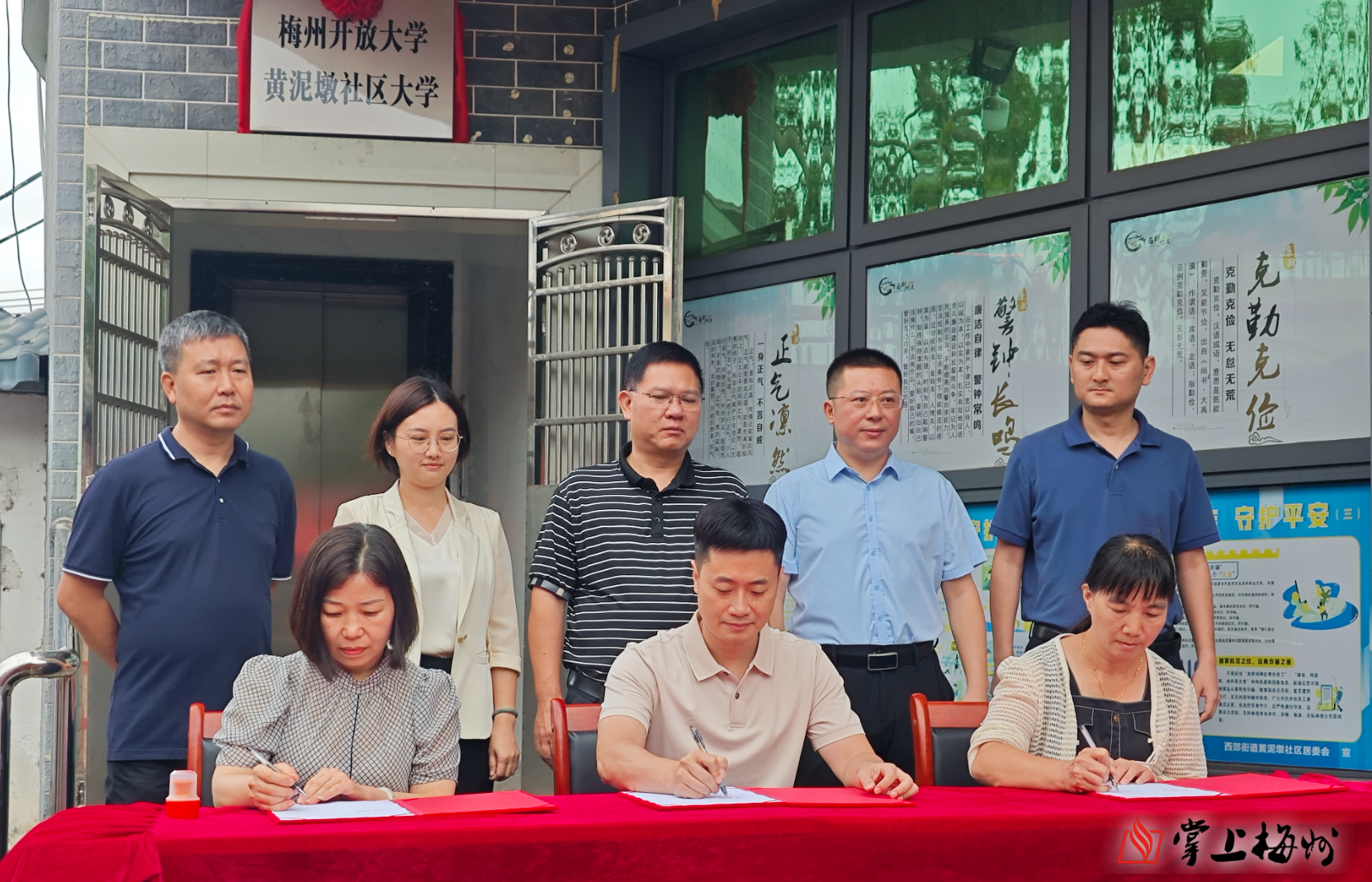 活动现场,梅州开放大学校长罗金良,市委社会工作部副部长、市委“两新”工委副书记汪东东,市妇联副主席侯可筠,梅州开放大学副校长黄柳梅,市教育局职终科科长谢军,西郊街道党工委副书记朱淦文共同为“梅州开放大学黄泥墩社区大学”揭牌。梅州开放大学、黄泥墩社区、梅江区风眠艺术培训有限公司的代表共同签署三方合作协议。