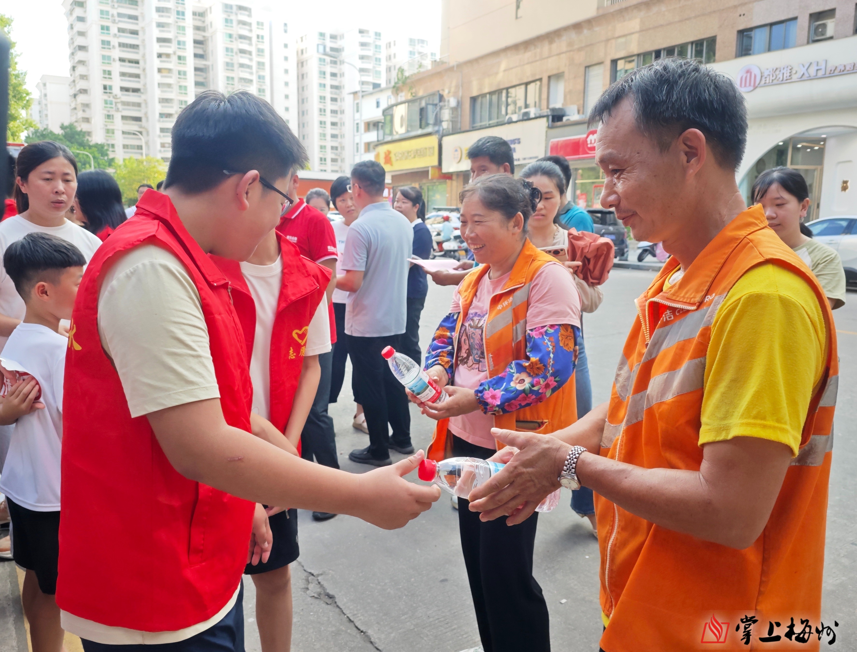 仪式后,数十位亲子志愿者为过往的快递员、外卖骑手、网约车司机等新就业群体,以及环卫工人、建筑工人、执勤民警等户外工作者送上饮用水。