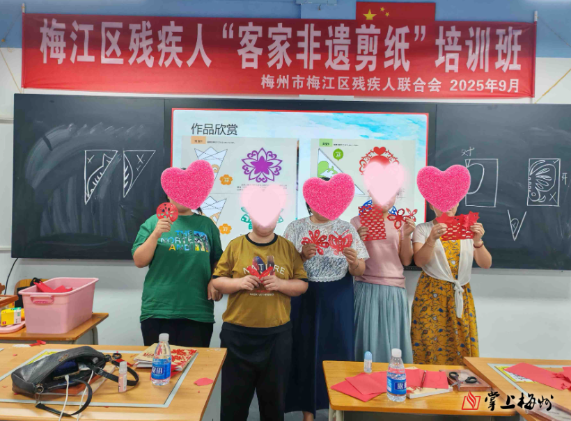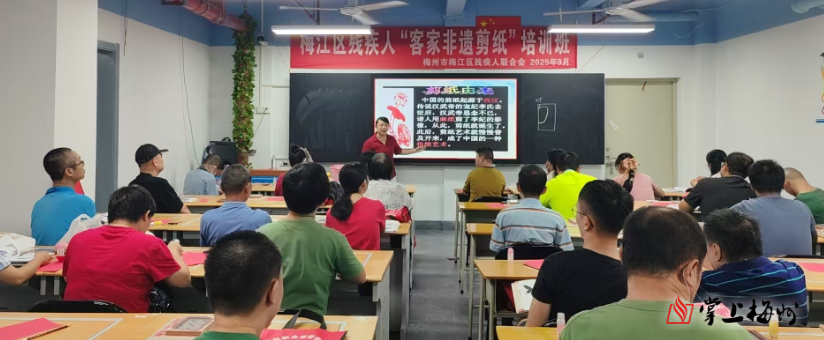 掌上梅州讯 日前,梅江区残联组织开展残疾人“客家非遗剪纸”培训班,由广东省残疾人职业培训基地(二级)梅州市梅江区启航职业培训学校承办,50名残疾人参加培训。