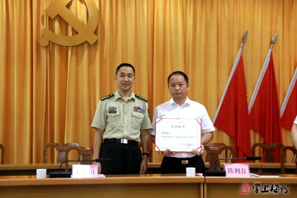 在大会上,邱浩浩代表区委组织部郑重宣读了区委、区人武部党委关于三角镇武装部政治教导员的任职命令。随后,由范东阳同志为新任命的三角镇武装部政治教导员、三角镇党委书记陈利春颁发了任职证书,并合影留念。