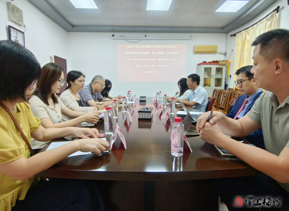 掌上梅州讯 为促进涉外法律服务需求与供给的有效对接,着力优化法治化营商环境,近日,由梅州市经开区、梅江区科工商务局和区司法局联合主办,广东华商(梅州)律师事务所具体承办的2025年商务法律服务月暨政策宣贯活动在区科工商务局举办。梅江区10家外资外贸企业主管领导和业务骨干以及区科工商务局、区司法局分管领导和相关股室负责人参加活动。