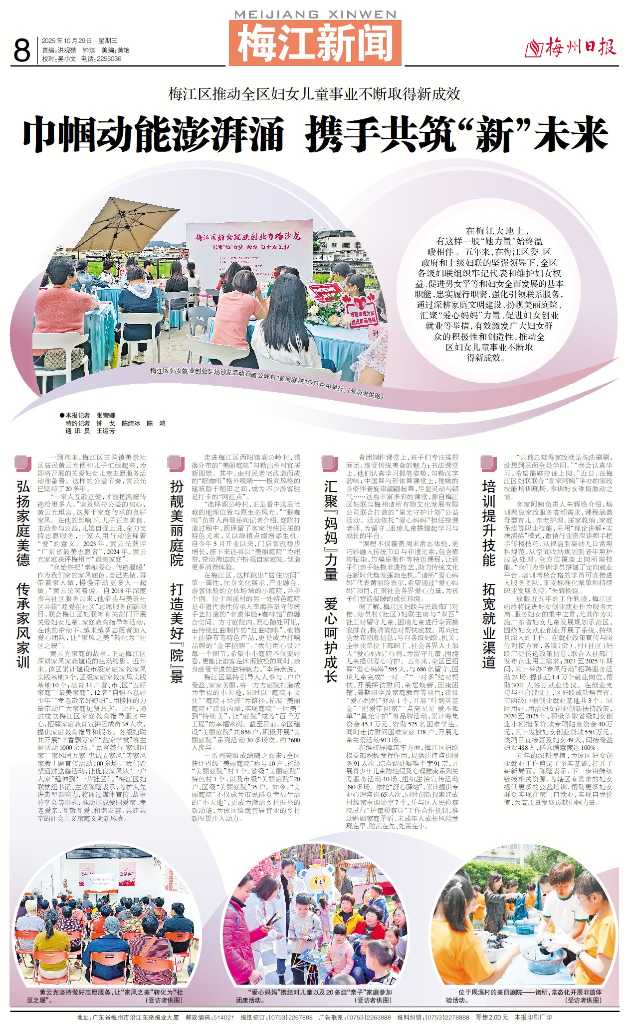 在梅江大地上,有这样一股“她力量”始终温暖相伴 。五年来,在梅江区委、区政府和上级妇联的坚强领导下,全区各级妇联组织牢记代表和维护妇女权益、促进男女平等和妇女全面发展的基本职能,忠实履行职责,强化引领联系服务,通过深耕家庭文明建设、扮靓美丽庭院、汇聚“爱心妈妈”力量、促进妇女创业就业等举措,有效激发广大妇女群众的积极性和创造性,推动全区妇女儿童事业不断取得新成效。