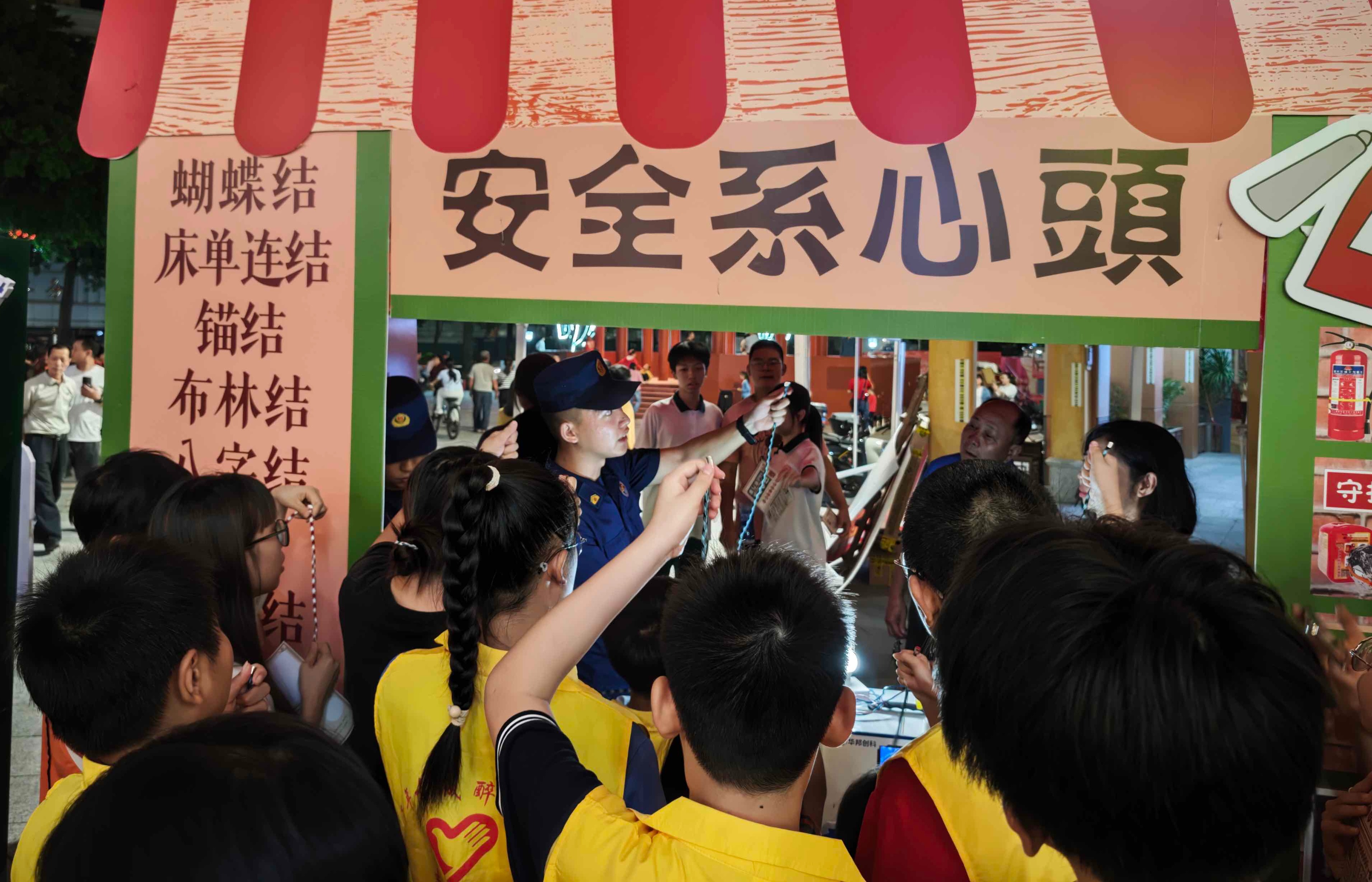 夜幕下的元城广场,消防主题摊位一字排开,充满复古风情的消防元素格外醒目。梅江消防的宣传员化身“摊主”,带着趣味打卡通关游戏、安全手册、定制文创小礼品热情迎客。活动现场设立了线上直播、趣味打卡闯关游戏、消防器材展示等区域,吸引众多市民驻足参观、体验。线上直播主要围绕普及家庭防火、消防常识、隐患查找、电动自行车以旧换新政策等进行线上有奖互动问答;闯关游戏区设置了套出消防隐患、趣味猜灯谜、火花翻翻乐、安全系心头——消防结绳体验等趣味游戏,吸引众多市民排队体验。消防器材展示区是小朋友们的最爱,看到帅气的消防器材及消防员们,纷纷上前想与消防器材及消防员来一次“零距离”接触。整个现场堪称一场消防“嘉年华”,在“游玩、教育、互动”中,让市民穿梭于各类体验游戏中,不少粉丝都赢得了心仪的消防周边文创礼品。