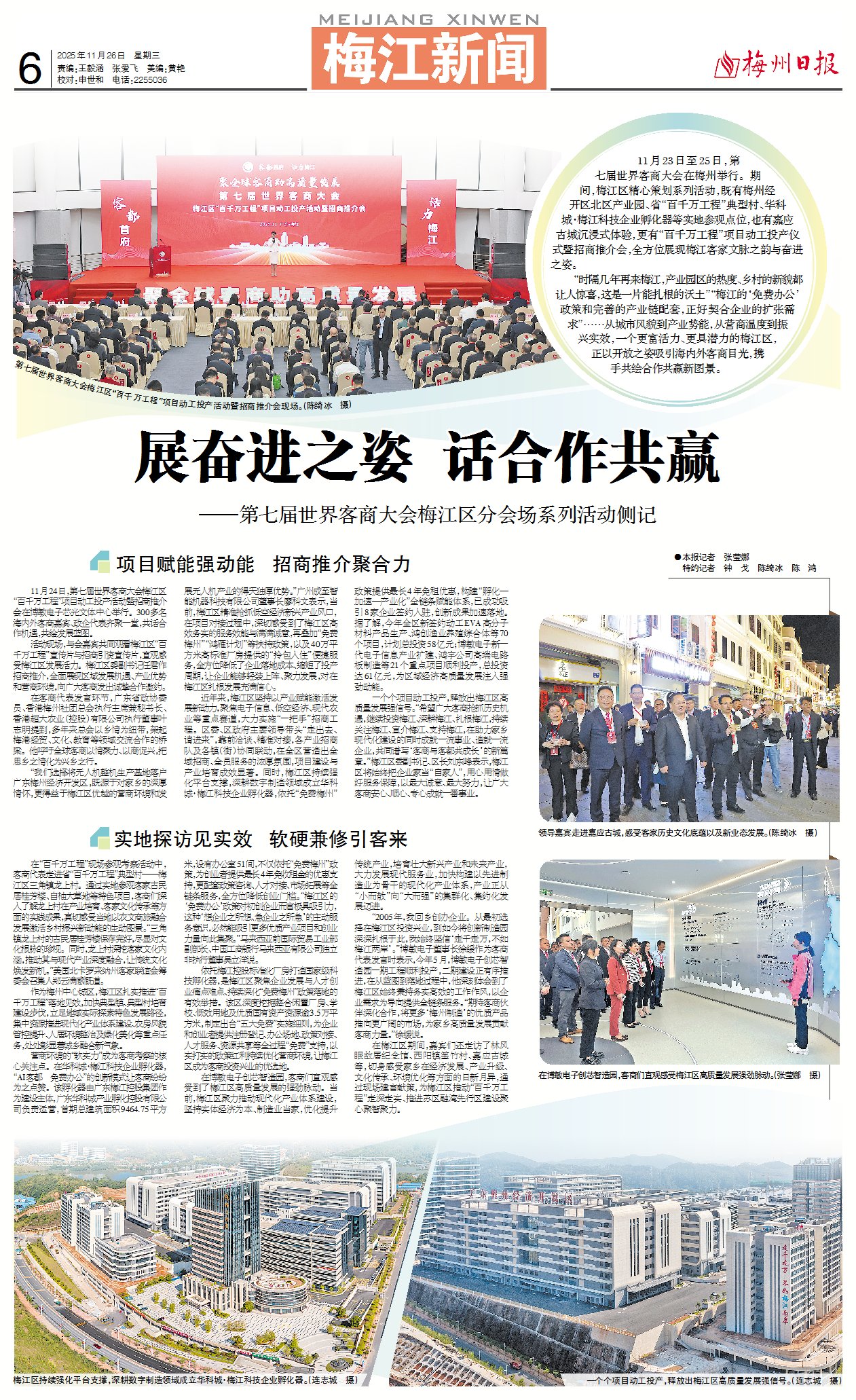 11月23日至25日,第七届世界客商大会在梅州举行。期间,梅江区精心策划系列活动,既有梅州经开区北区产业园、省“百千万工程”典型村、华科城·梅江科技企业孵化器等实地参观点位,也有嘉应古城沉浸式体验,更有“百千万工程”项目动工投产仪式暨招商推介会,全方位展现梅江客家文脉之韵与奋进之姿。