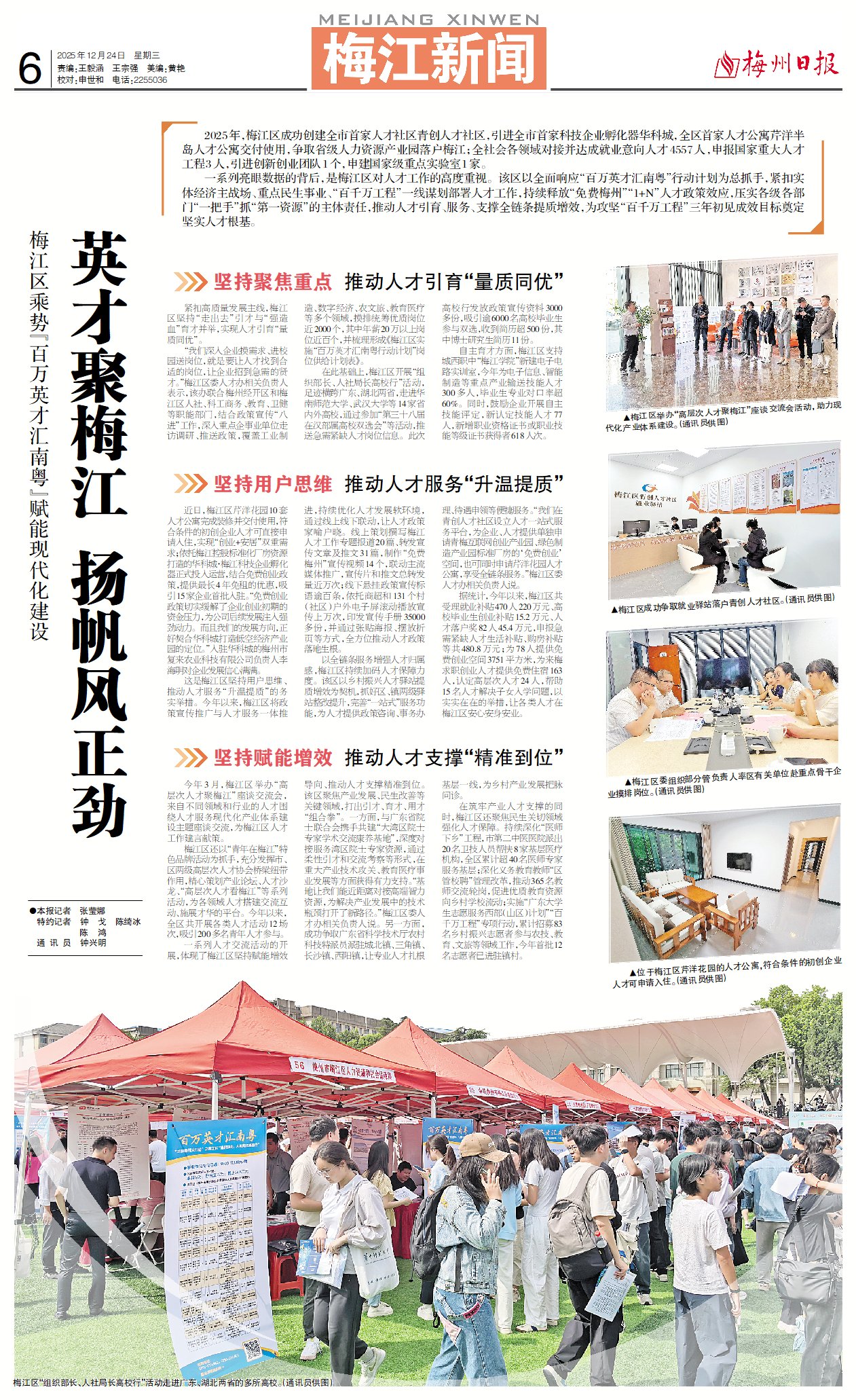 一系列亮眼数据的背后,是梅江区对人才工作的高度重视。该区以全面响应“百万英才汇南粤”行动计划为总抓手,紧扣实体经济主战场、重点民生事业、“百千万工程”一线谋划部署人才工作,持续释放“免费梅州”“1+N”人才政策效应,压实各级各部门“一把手”抓“第一资源”的主体责任,推动人才引育、服务、支撑全链条提质增效,为攻坚“百千万工程”三年初见成效目标奠定坚实人才根基。