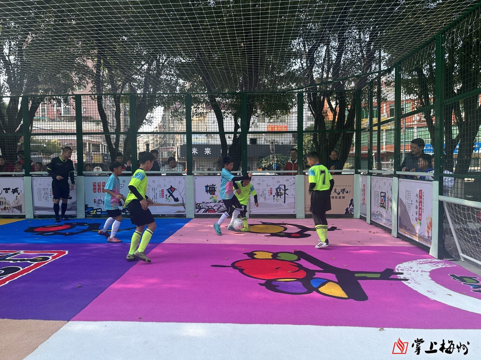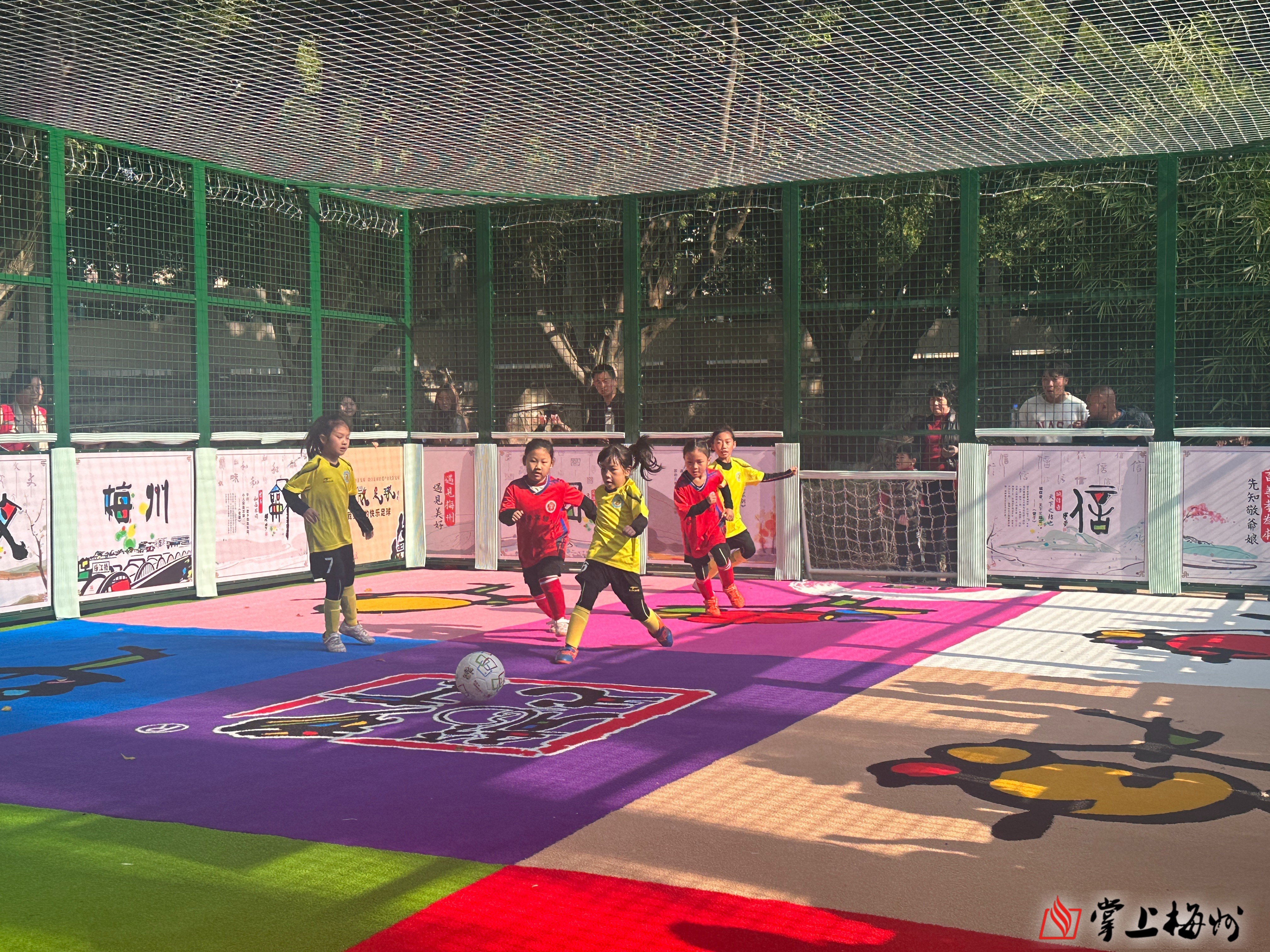 据了解,该场地由中国彩书创始人、广东省工艺美术大师何柏俊打造,他秉持“文化和创意反哺足球”的初心,以彩书国学为赋能核心,将国学经典、客家文化与足球运动深度融合,构建起“德育、美育、体育”三育并举的成长课堂,为青少年勾勒出“做好人、读好书、踢好球”的多维成长蓝图。“彩书微足球项目灵活多变,不仅适用于社区、景区、街区、商圈等多样化的日常微场景,还能充分利用城市中未得到充分开发的微型空间,甚至是那些不规则的三角地带,使其焕发新的活力。”何柏俊表示,希望通过此次赛事,以及在嘉应古城旁打造的四个足球场地,吸引更多人关注笼式足球,让孩子们在体验与竞技中收获快乐、提升球技、爱上足球。