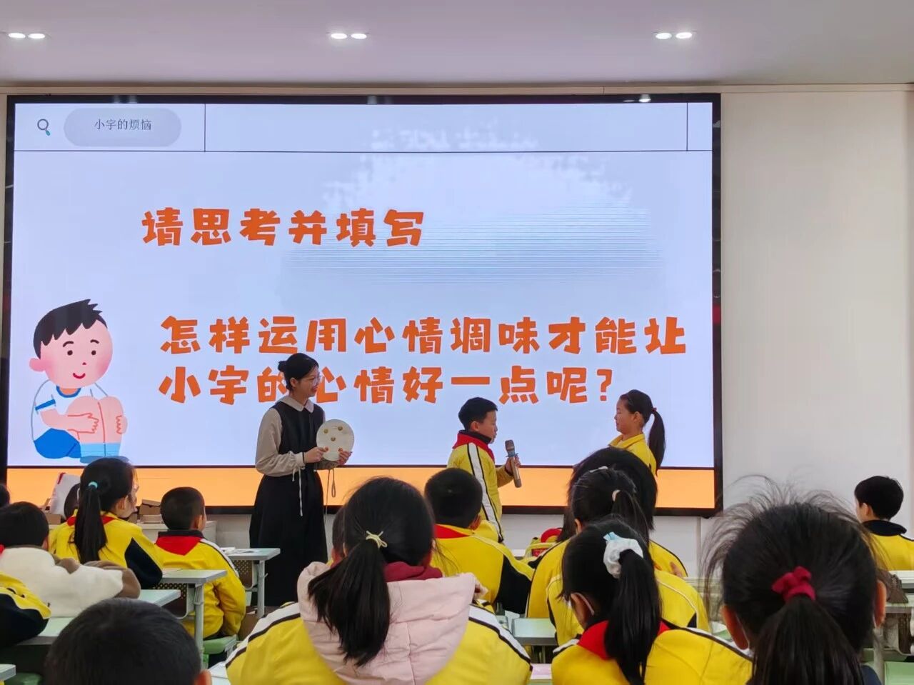 最后在“整合结束”阶段,学生们主动总结自己调节情绪的小妙招,相互交流借鉴。全体师生一同朗读情绪小口诀,将课程中的知识点转化为朗朗上口的记忆点,让科学调节情绪的方法深入人心。