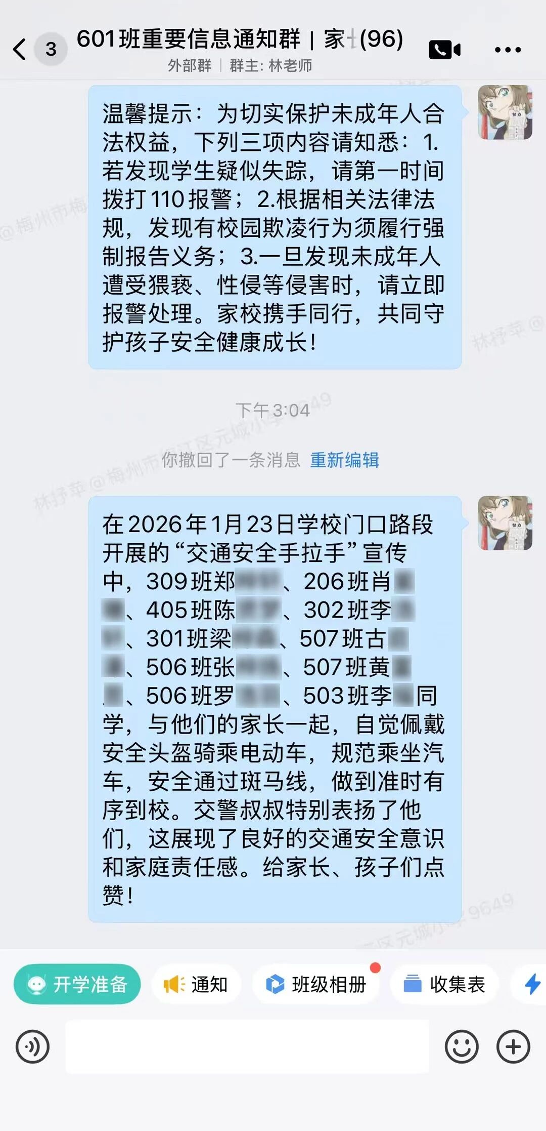 活动后,各班级班主任也在班级微信群内点名表扬,详细列举学生及家长规范佩戴安全头盔、主动礼让行人、文明依规驾驶、安全有序通行的典型行为,进一步放大正向激励效应,有效带动更多家庭重视交通安全、践行文明出行。