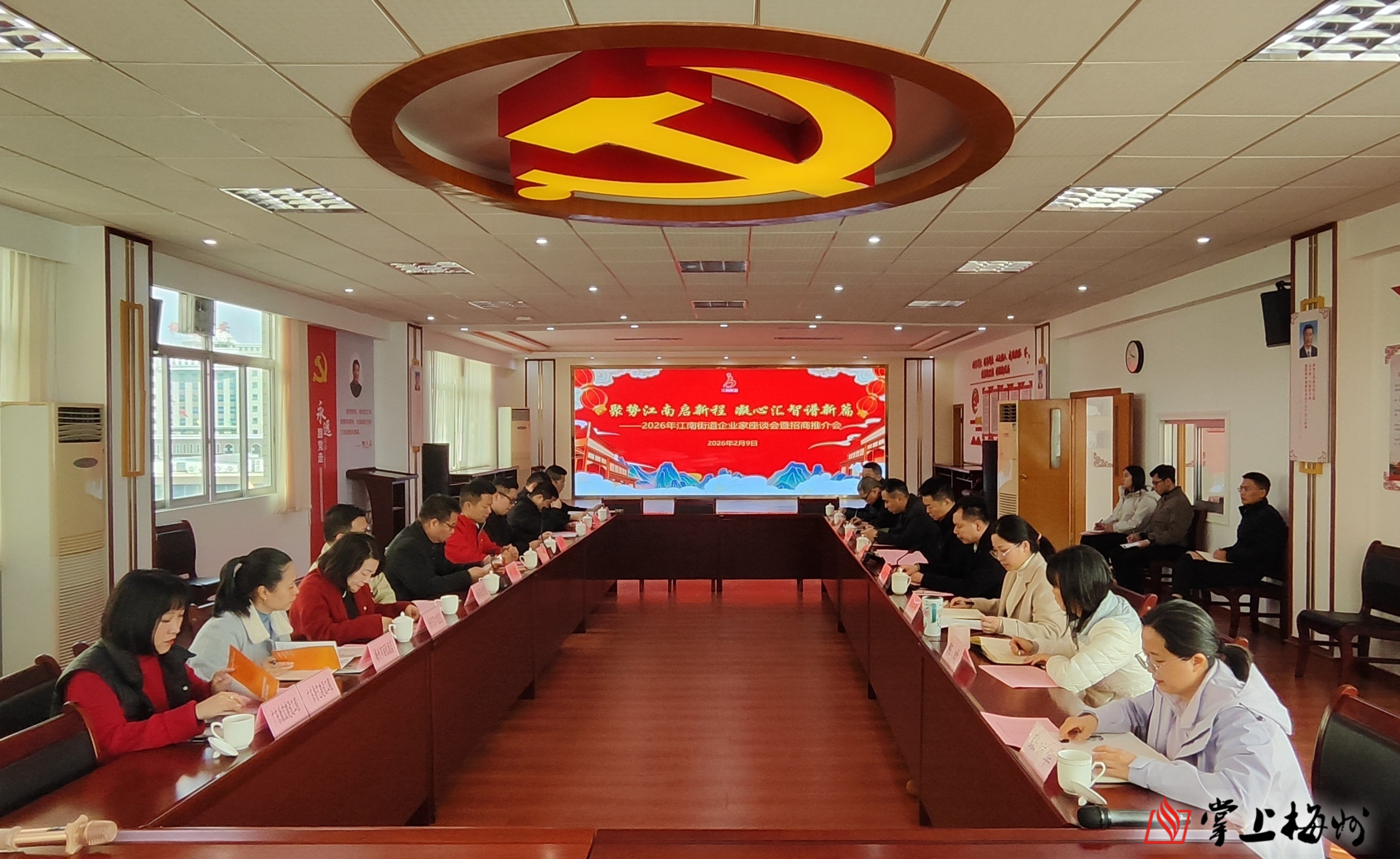 2月9日,梅江区江南街道召开2026年企业家座谈会暨招商推介会,邀请辖区内企业家代表等齐聚一堂,共谋江南高质量发展。会议由江南街道党工委书记林峰主持,江南街道相关领导参会。