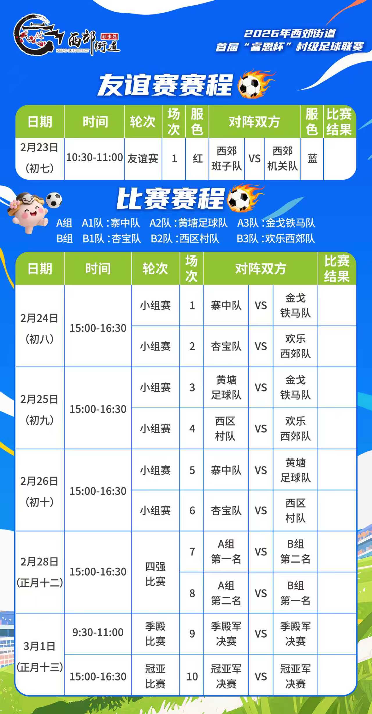 本次联赛以“绿茵燃动活力西郊,足球同心筑梦乡村”为主题,得到辖区多家企事业单位的大力支持。赛事共有六支村级队伍参赛,包括欢乐西郊队、寨中队、黄塘足球队、西区村队、金戈铁马队及杏宝队。