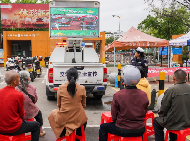 流动宣传车循环播放警示教育视频,直观呈现不戴头盔、乱穿行等违法行为的危害,吸引居民驻足观看。