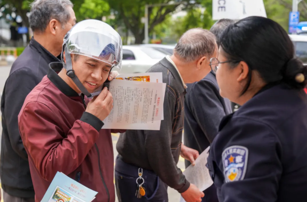 活动现场悬挂醒目横幅,暖意融融。女警们结合居民出行特点,讲解不戴头盔、酒驾醉驾等高频违法危害,耐心解答居民们关于电摩上牌、头盔佩戴的疑问,手把手示范安全头盔的正确佩戴方法。