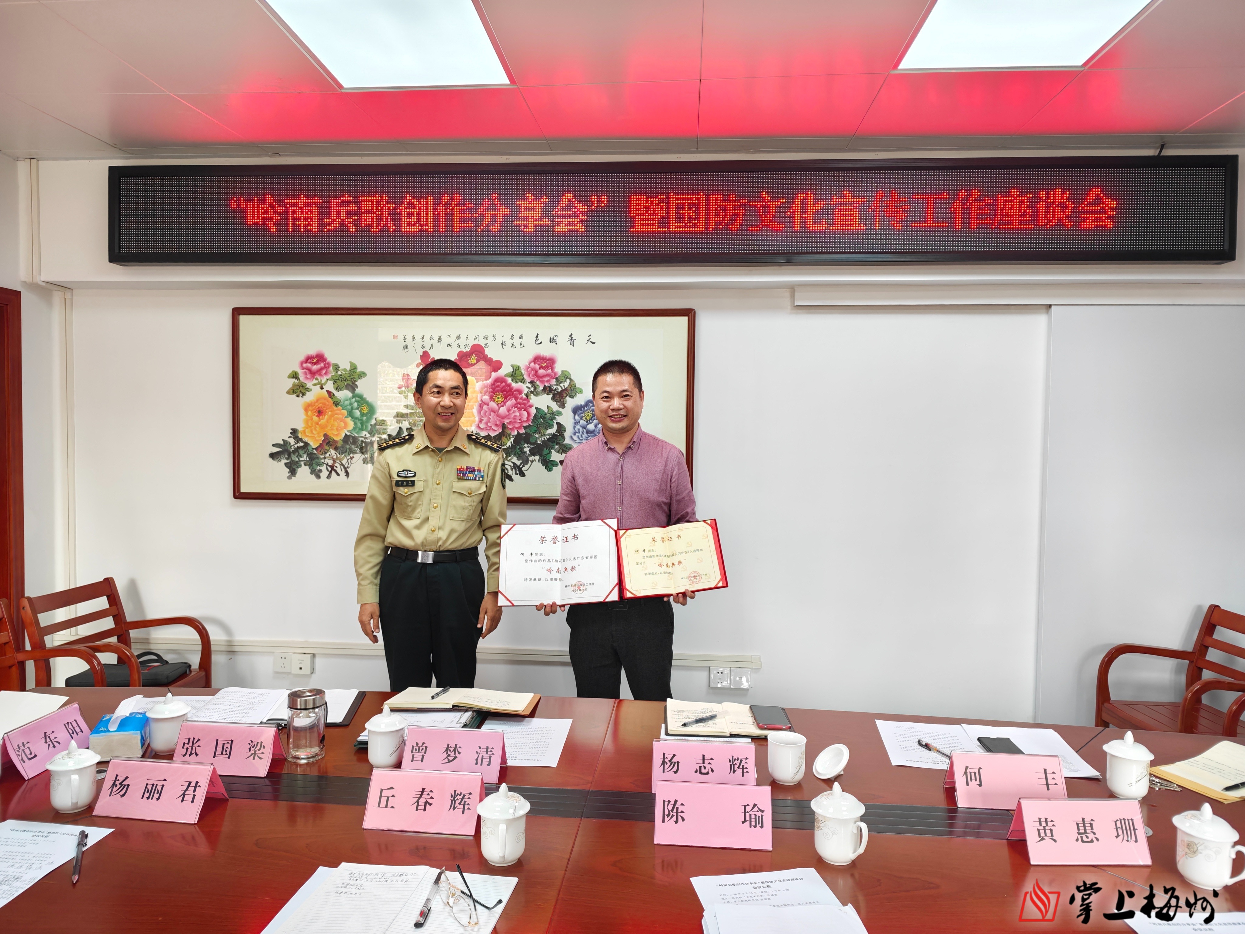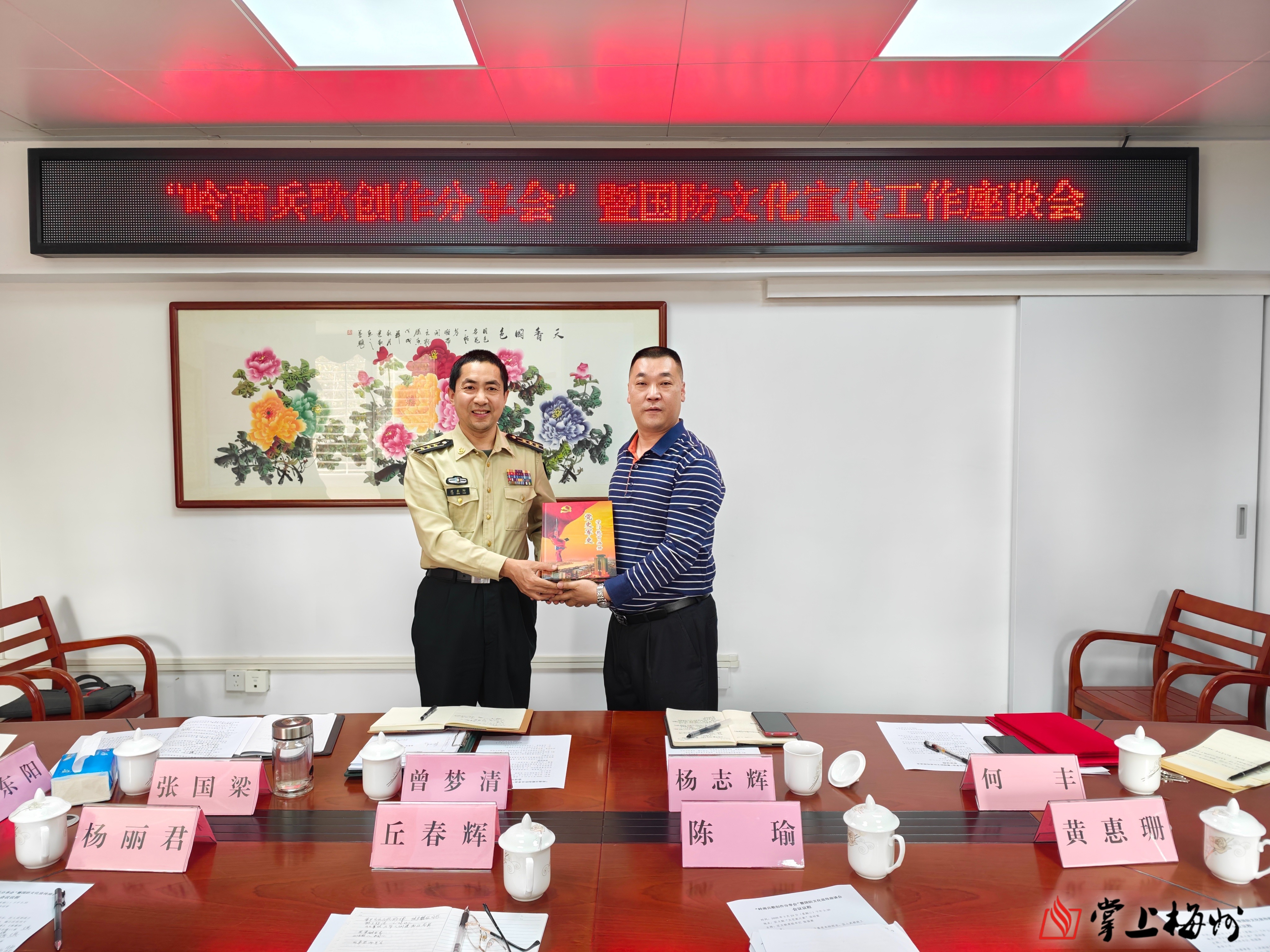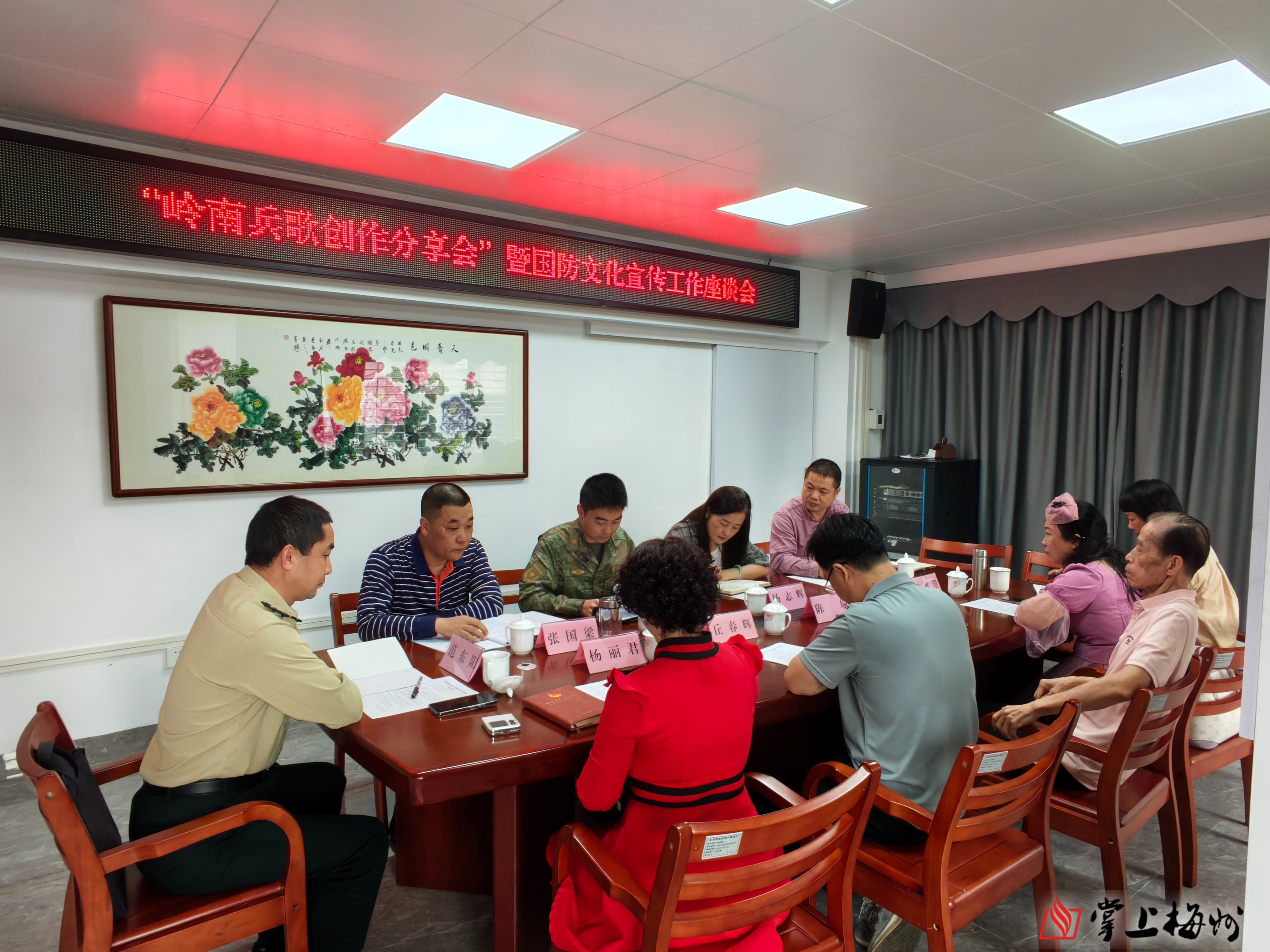 3月24日下午,“岭南兵歌创作分享会”暨国防文化宣传工作座谈会在梅江区文联会议室召开。区委常委、人武部领导范东阳,区文联全体干部以及区民间文艺家协会负责人、参加“岭南兵歌”创作活动的词作者、曲作者等人参加了座谈会。会议由区文联党组书记张国梁主持。