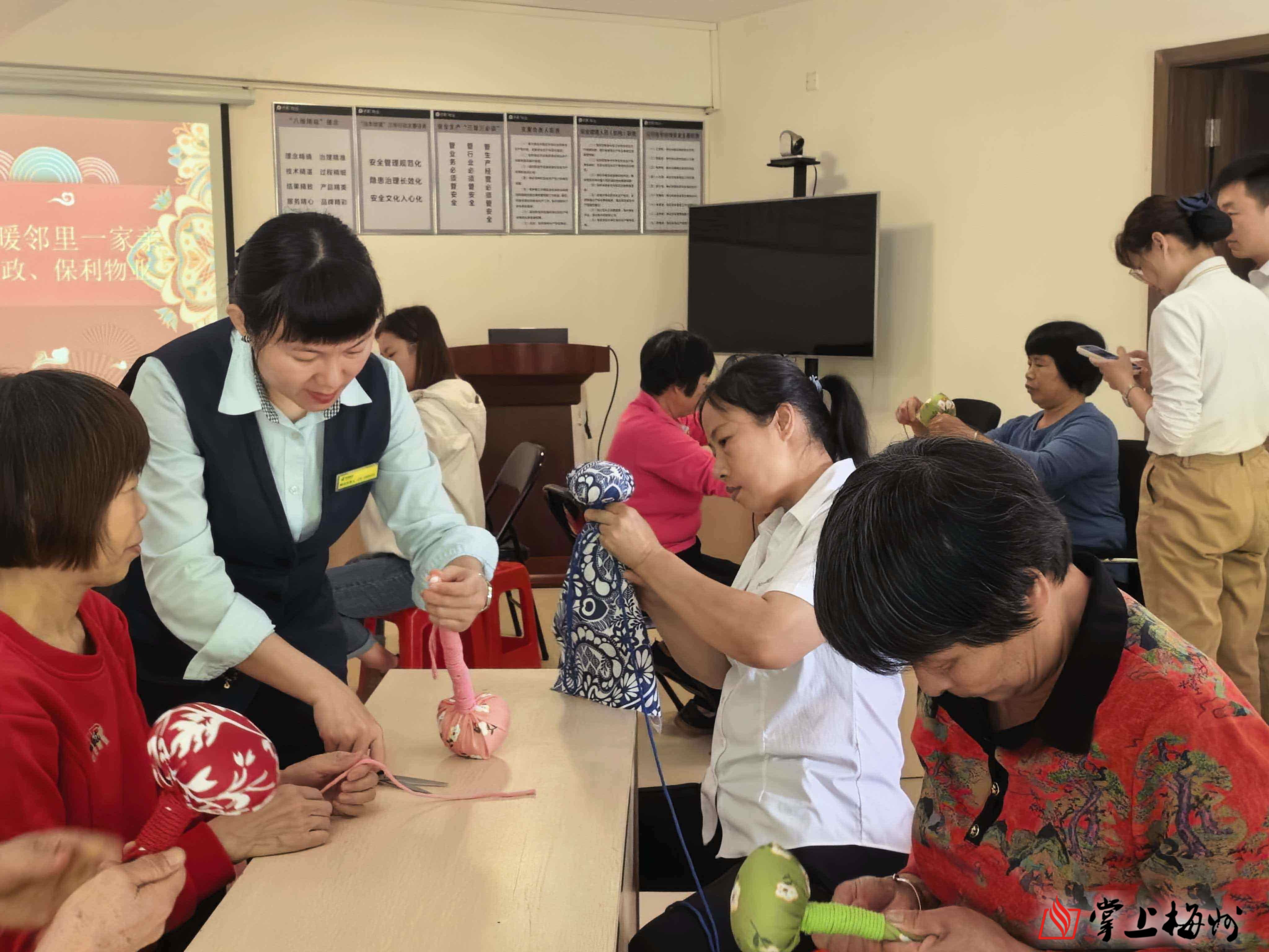 活动初始,特邀传统手工艺老师现场演示艾草锤的制作步骤。在老师的分步演示下,居民们将晾晒好的艾草细心捆扎、用布料包裹、再以棉线缠绕固定在木棍上,动作从生疏渐入娴熟。“红梅聚力”志愿服务队的队员们穿梭于各操作台之间,耐心协助老年居民缠绕固定、调整松紧,手把手传递温暖。活动现场欢声笑语,大家互相交流缠绕技巧,70岁的张阿姨举着亲手制作的艾锤笑道:“这艾草香闻着就神清气爽!”