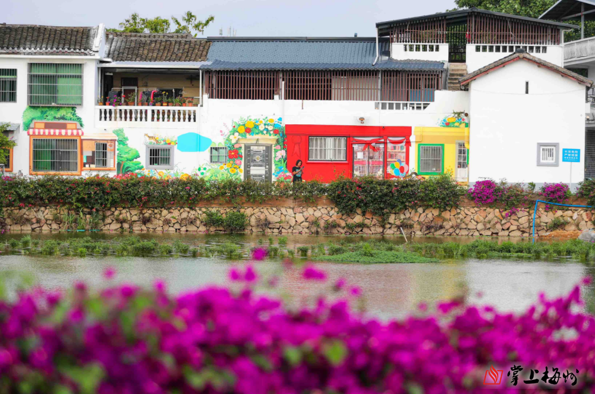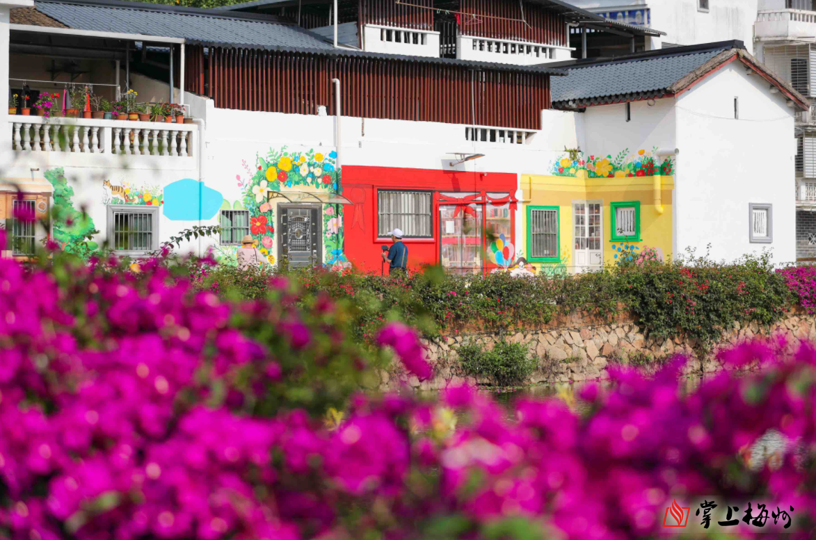 走进该公园,首先映入眼帘的是一幅幅生动鲜活的大型主题墙绘。娇艳盛放的花卉、葱茏舒展的绿植、灵动可爱的小动物形象跃然墙上,既洋溢着自然生机,又饱含童真童趣。水塘沿岸,正值盛花期的三角梅开得热烈奔放,花枝层层叠叠、倾泻如瀑,玫红花朵密密匝匝、绚烂似霞,与周边古朴的客家民居相映成趣。