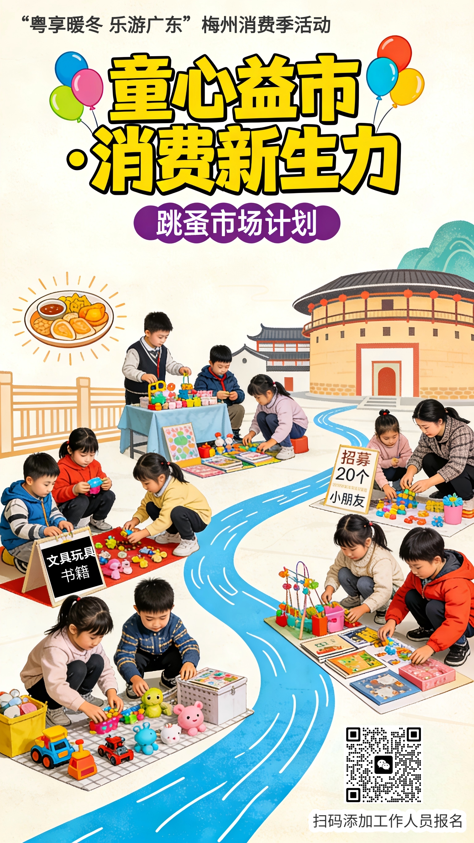 为了给小朋友打造“从小参与消费、从小理解经济、从小助力循环”的生动课堂,让孩子在交易中感知市场脉搏,在交换中激发家庭消费活力,共同为梅州消费市场注入温暖而可持续的“新鲜流量”,在“2025梅州汽车家电手机潮购节”暨“梅品惠”冬季促消费活动期间,我们特别发起“童心益市·消费新生力”跳蚤市场计划,邀你一起来东山新天地当摊主、玩买卖、助消费!让孩子的闲置玩具“活起来”,让周末时光“趣起来”,让梅州消费“暖起来”!