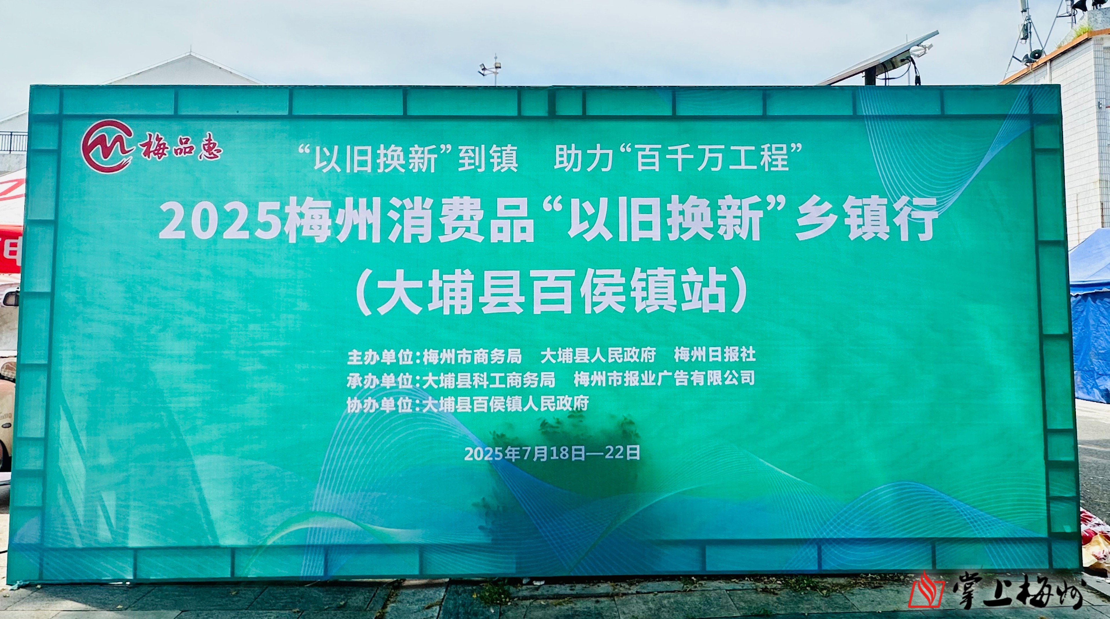 掌上梅州讯 7月18日上午,2025梅州消费品“以旧换新”乡镇行(大埔县百侯镇站)活动在百侯镇影剧院广场启动,活动共举办5天(7月18日至22日)。
