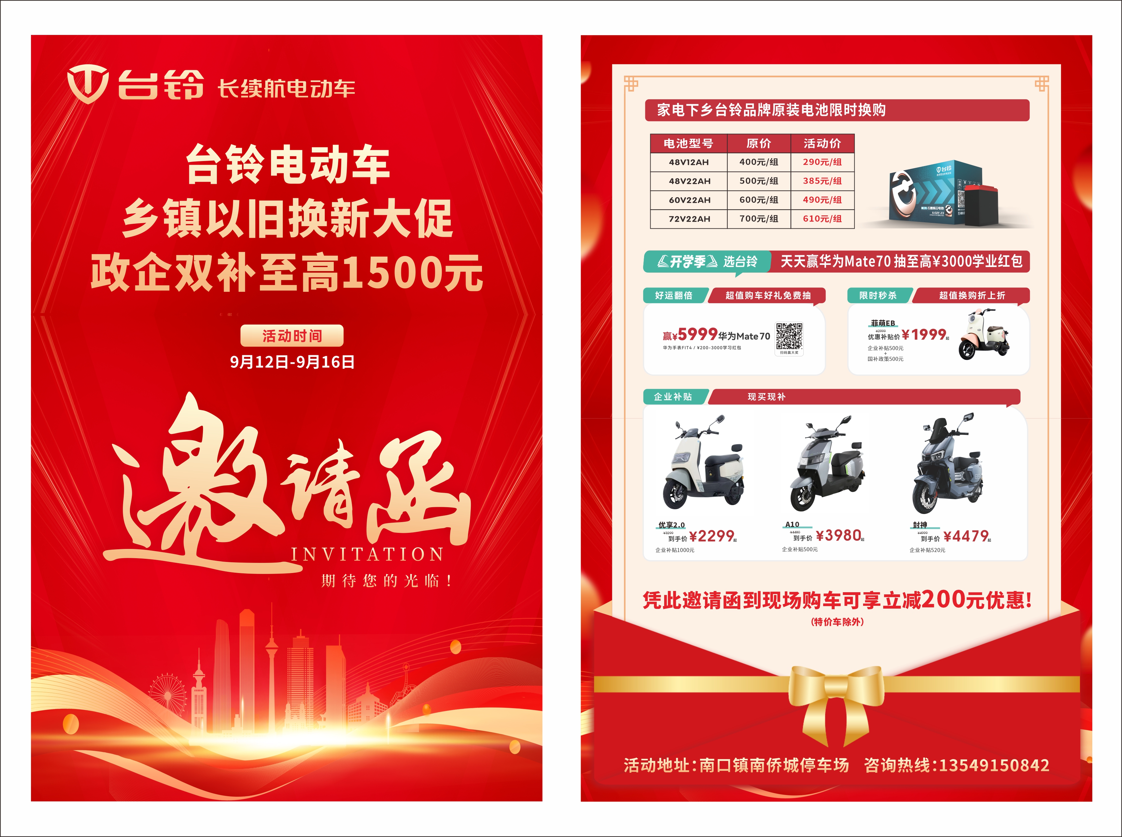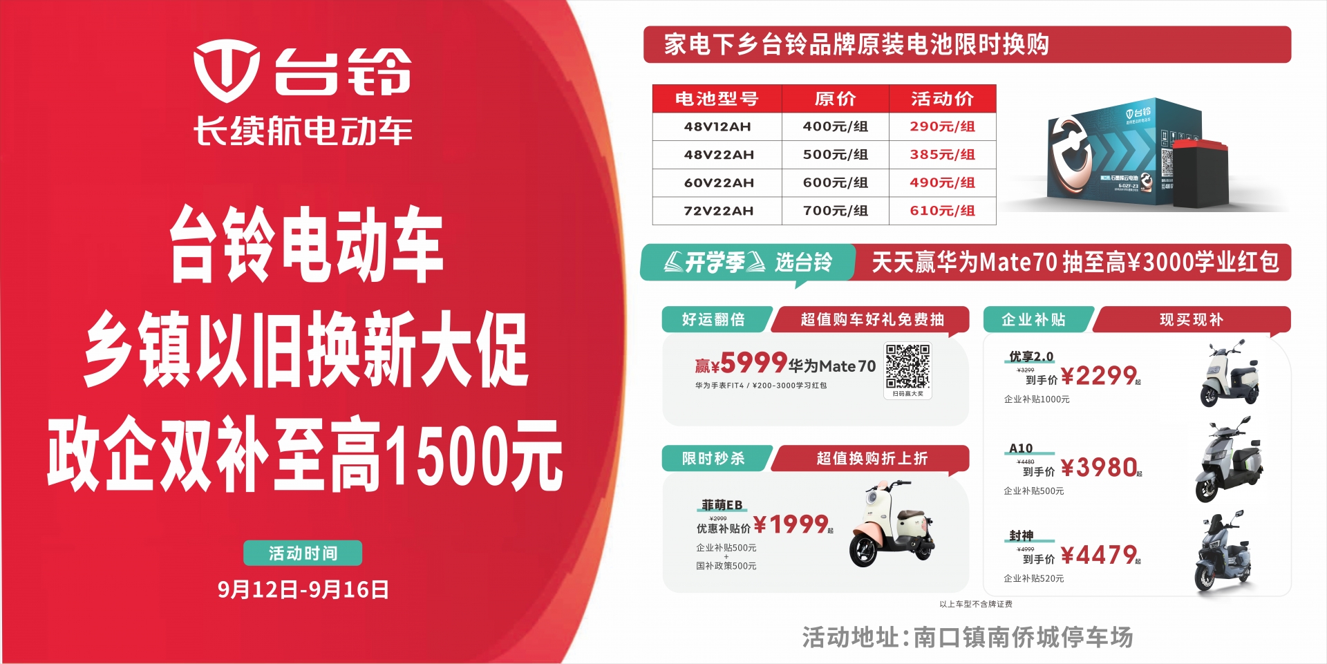 ❤电动车展区:台铃电动车乡镇以旧换新大促!政企双补至高1500元,台铃疯狂5天特惠来袭!邀您相聚南口镇南侨城停车场,福利不停歇!