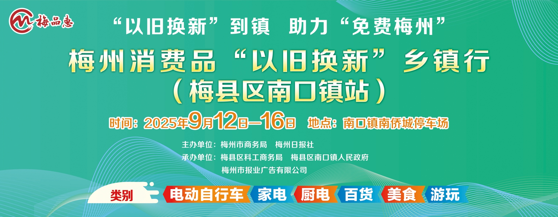 9月12日—16日,由梅州市商务局、梅州日报社联合主办的2025梅州消费品“以旧换新”乡镇行活动将走进梅县区南口镇。本次活动以“政府搭台、企业让利、群众受益”为核心,旨在通过“以旧换新”政策引导与市场驱动相结合,推动乡村消费升级,助力绿色经济高质量发展,让南口镇百姓在家门口畅享品质生活新体验。