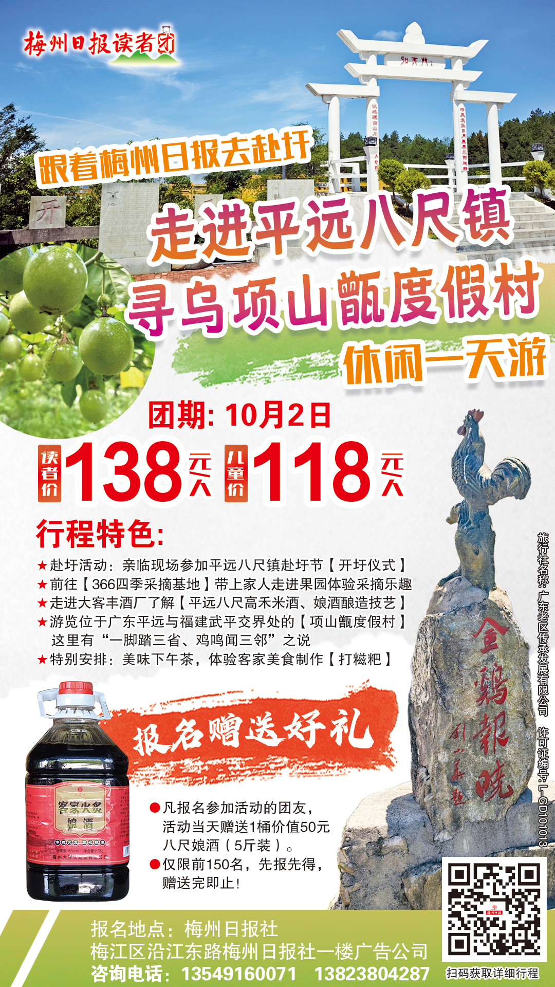 报名加入梅州日报八尺一日游读者团,即可获赠一桶5斤装八尺娘酒,带你走进酒企探秘、366基地采摘百香果、感受“一脚踏三省”、体验客家打糍粑,感受美丽乡村!