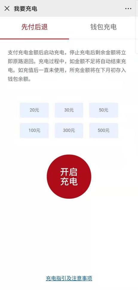 4、登录后可选择“先付后退”或“钱包充电”两种充电启动模式。“先付后退”模式下,您在启动充电前可预存一定金额的费用,充电结束后,未消费余额将自动原路退回,无须您申请退款。