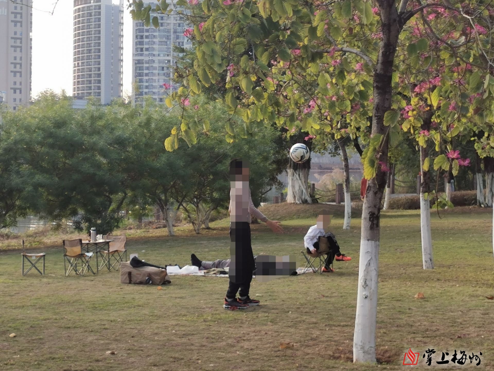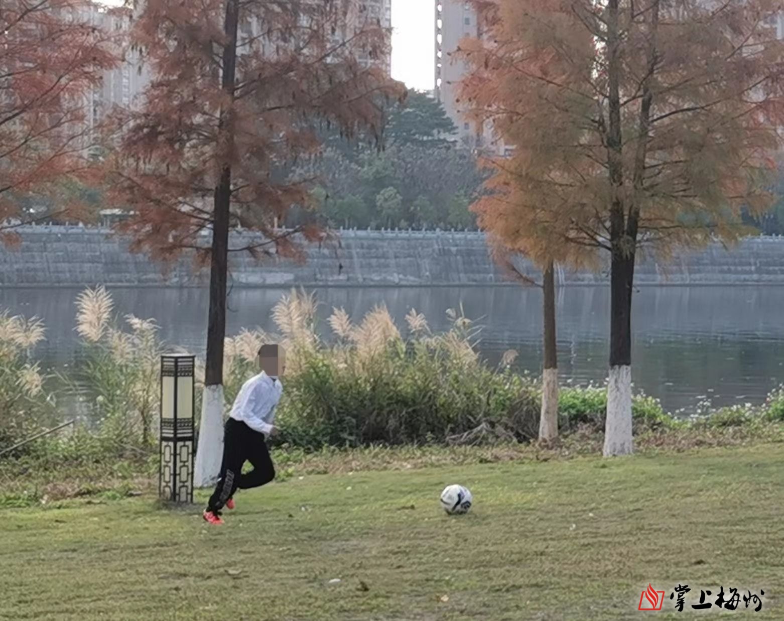 掌上梅州讯 公园里的树木、花草等自然景观不仅能增添美感,也能为大家带来愉悦心情,是需要大家共同爱护的公共设施。然而近日,有市民向本报《民生一线》栏目反映,梅城芹洋半岛滨水湿地公园里有人将草坪当作“足球场”,来回奔跑踢球,可能对草坪造成损坏。