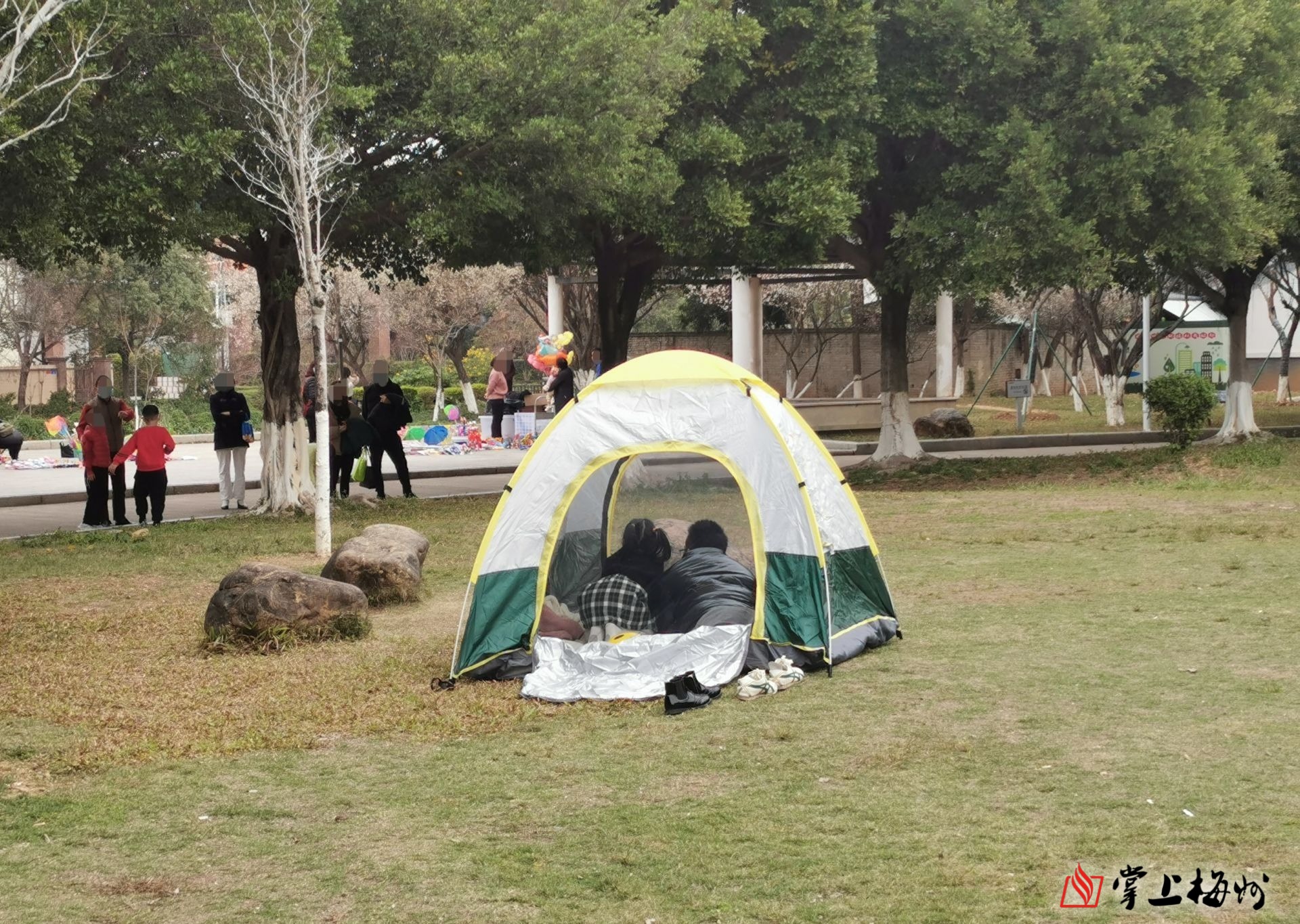 近几日,客家公园里的梅花渐次盛放,引来了不少游客前来观赏。闻着淡淡梅香,漫步在公园里本是件舒心事,但记者发现,个别游客在拍照时为了追求视觉效果便拉扯树枝。还有不少家长无视公园随处可见的“莫踏青草”等文明劝导标语,带着孩子随意践踏草坪、追逐打闹,或在草坪上搭帐篷、铺坐垫。在蕉岭县镇山公园,记者也看到有个别小朋友在摇晃树枝,使得树叶纷纷往下掉。