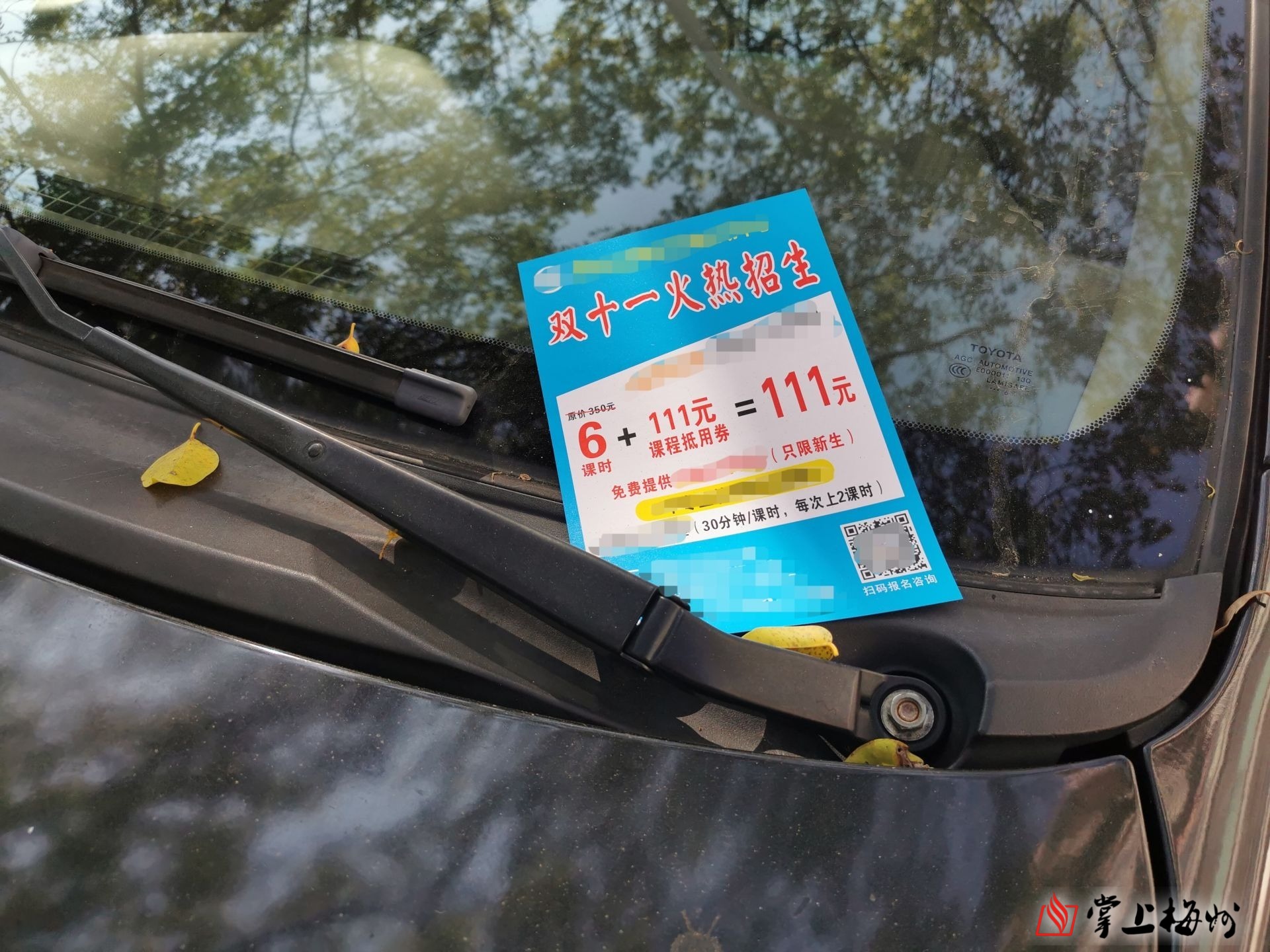 近日,根据报料市民提供的线索,记者走访了梅城部分街道。在梅江区龙安路、嘉恒路、和友路、梅建路,均发现多辆停放在道路两边的私家车挡风玻璃上被夹放了广告海报或小卡片,上面的内容五花八门,包括兴趣培训班宣传、招商广告,还有关于男性疾病治疗的内容,卡片上大多印有二维码、联系电话和地址。