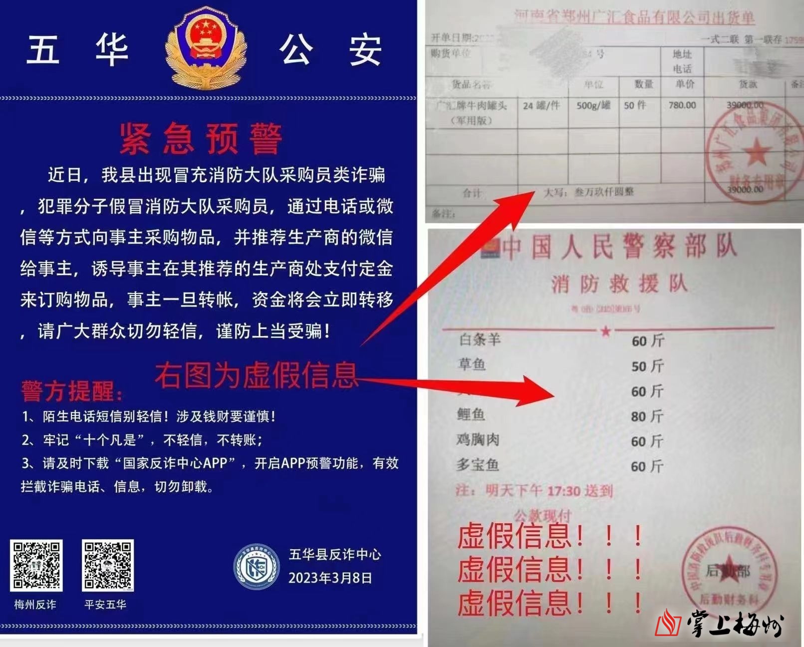 据了解,针对近日出现的假冒消防人员诈骗一事,五华县消防救援大队接到举报后,立即派员前往派出所了解近期以大队名义进行采购食品进行诈骗的情况。随后商议如何开展防诈骗宣传等工作事宜,并联合县反诈中心向社会面发出紧急预警。消防部门提醒:消防部门有明确的采购规章制度和流程,不会以任何名义要求群众垫资采购。以消防部门名义,向社会单位或个人开展以消防安全培训之名推销或采购消防产品或其他商业服务的行为,都属于诈骗行为。请广大市民擦亮眼睛,谨防上当受骗。碰到疑似情况,请及时与消防部门核实,没有核实前坚决不打款不支付,有必要时请及时报警。