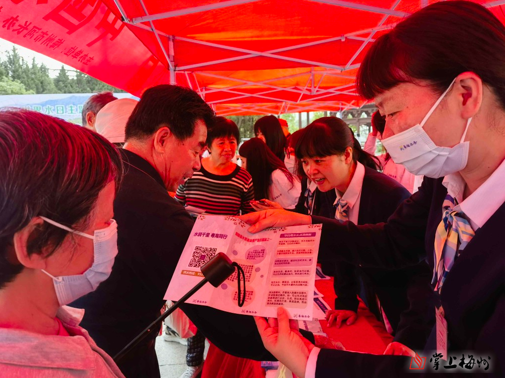 在剑英公园,记者看到,活动吸引了许多市民前来参与。“淘米用的水不要直接倒了,可以拿来浇花、冲厕所等二次利用”“现在缴水费不用跑营业厅了,简单几步就能搞定”“手机扫一扫参与线上节水小游戏,可以领取礼品”……在梅州粤海水务有限公司摊位前,工作人员向来往的市民发放节水宣传资料,介绍节水小妙招,解答市民用水相关问题,并引导市民参与粤海水务线上节水小游戏领取相关礼品等。在其他摊位,相关单位的工作人员也在忙着向群众发放宣传资料,向群众讲解、传递有关水法律法规、水资源节约利用、河湖治理保护、水文、供水、社会信用等内容。