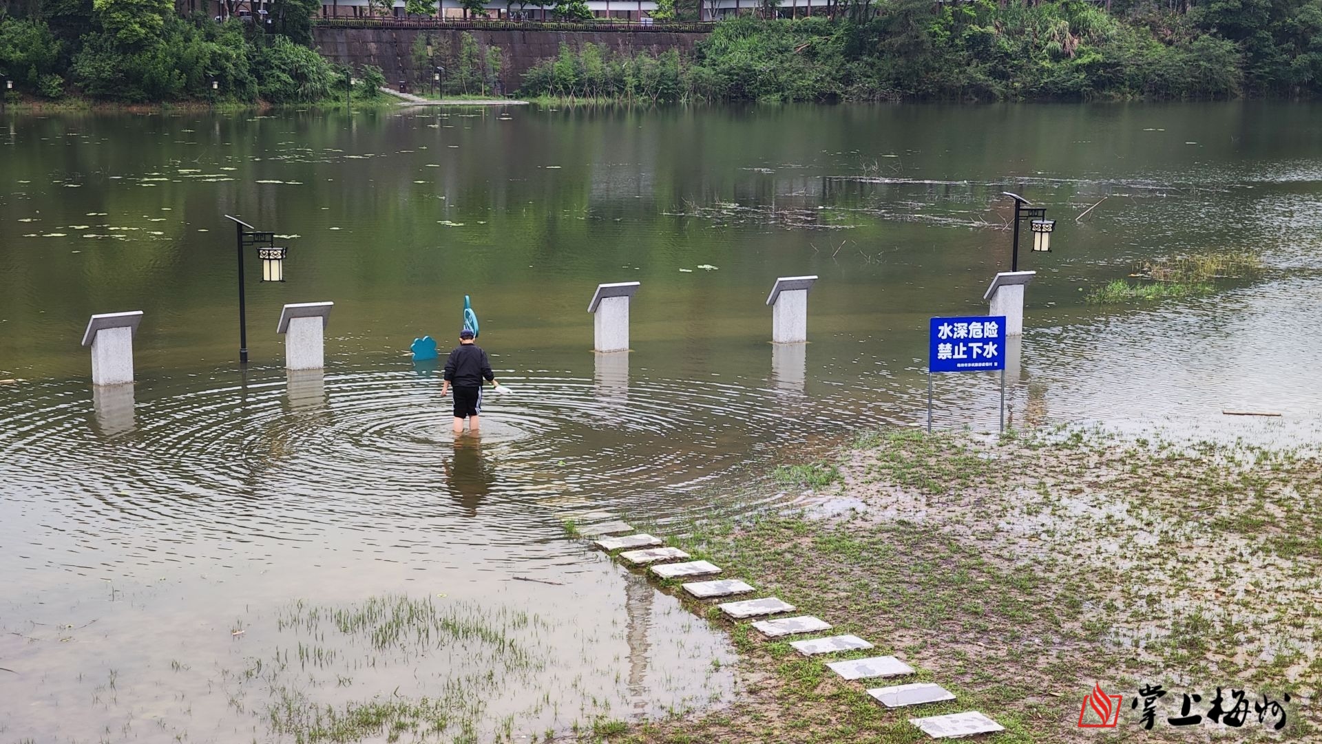 清明节期间,记者在梅城泮坑风景区的休闲长廊等区域看到,因连日持续降雨的缘故,泮坑水库水位上涨明显。虽然水库边竖立着“水深危险,禁止下水”等字样非常醒目的警示牌,但个别市民依然带着自己孩子到水库边上戏水、捞鱼。只见他们拿着网兜,踩踏着公园草地,在水库边上来回地寻找着鱼的踪迹,有小孩为了捞鱼,直接走到水位较深的区域,这种行为既不文明又非常危险。此外,记者发现休闲长廊的亭子里有几位市民自带音响设备,拿着话筒放声高歌,格外刺耳。