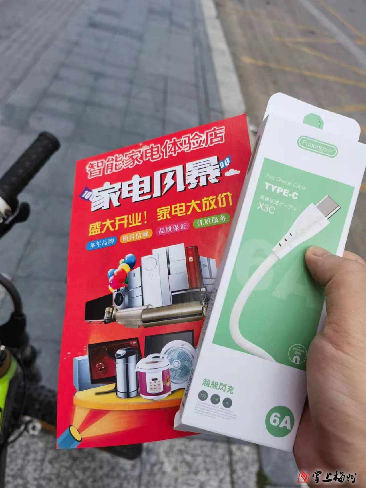 日前,记者来到梅城万达广场。不久,一名手拿宣传单和礼品的营销人员主动走近记者,并派发一张并未标注公司名、店名、地址的家电宣传单,见记者未接,便又从袋子里掏出一根数据线说:“算了,小礼品直接送你吧。”见记者接过了数据线,对方随即提出了要求,“你帮我点个赞就好了,支持一下我们在梅州的家电公司,不需要关注的。”