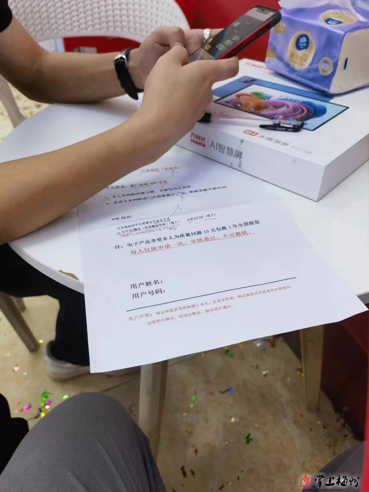 记者表示,支持他们软件没有问题,并问是否可以领取平板了。“先不要着急,你先下载注册好软件,并在我们这里做个登记即可。”随后,工作人员让记者扫码下载一个名为“乐淘物”的购物软件。“为了确保你在日后能支持我们软件,需要先用支付宝授权你的信用分,之后会有个5980的额度充值到你账号上,可用这额度在上面购物消费,使用不限时间。”该店工作人员说道,并拿出一张产品领取申请表,欲让记者填写。