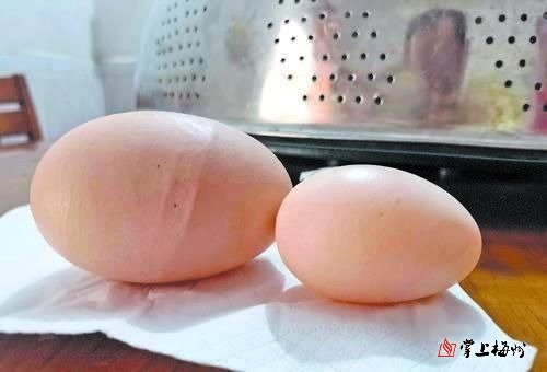 当天上午,记者驱车来到梅城三角镇湾下侯屋。张姨热情地把记者领进门,让我看她放在桌上这枚鸡蛋。乍一看,这枚鸡蛋给人感觉只是比普通鸡蛋稍大一点,不过,张姨拿来了其他普通鸡蛋进行对比,一大一小很直观就显示出了差别(如右图,梁志航摄)。“我家有8只母鸡,都是去年买回来的,圈养在龙眼树下,平时就喂谷和麸皮这些食物,每只母鸡产的蛋都像初生蛋那么小,稍大一点也就40克左右重。”张姨说道,今天她去鸡笼看到了这只蛋特别大,年逾七旬的她也没见过这么大的鸡蛋,这让她觉得很新奇。记者称了一下鸡蛋,发现有100克重,另外量了一下,有8厘米长,是张姨家其它普通鸡蛋的两倍多。“这只蛋,应该是双黄蛋。”张姨说道。