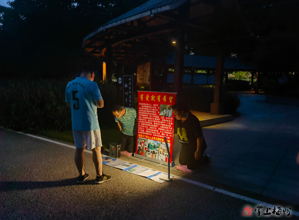 6月20日晚上7时许,梅城剑英公园内散步市民来来往往。在公园正门附近的小路边,一对中年夫妇面向路人低头下跪,并用音响播放着感人的音乐,展示的海报文字密密麻麻,稍微细看,可发现这夫妻俩是为10岁的患尿毒症儿子筹钱治病。两人身前还摆放着好几份就医证明等材料。在昏暗的灯光和感人音乐的烘托下,不少散步市民驻足。有的市民稍微看了几秒,就掏出手机扫描对方的二维码捐钱,有的退休老人甚至还未走近,就提前掏出百元现金捐献出去。对此,该对夫妻也是连连作揖,以作感谢。