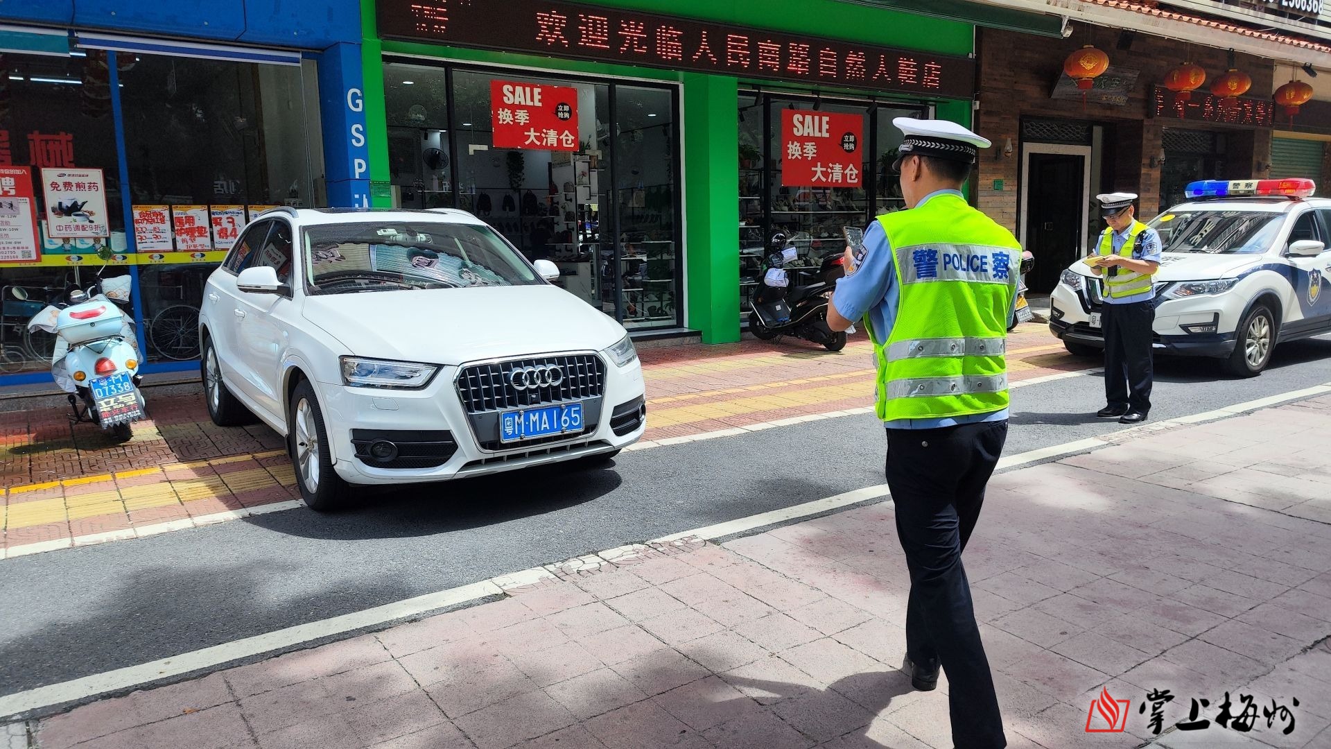 掌上梅州讯 近日,有市民反映,梅县区公园北路、人民南路等多个路段经常有车辆违停、商贩霸占停车位的情况,针对这些不文明行为,市交警部门组织警力持续开展了相应的整治行动。