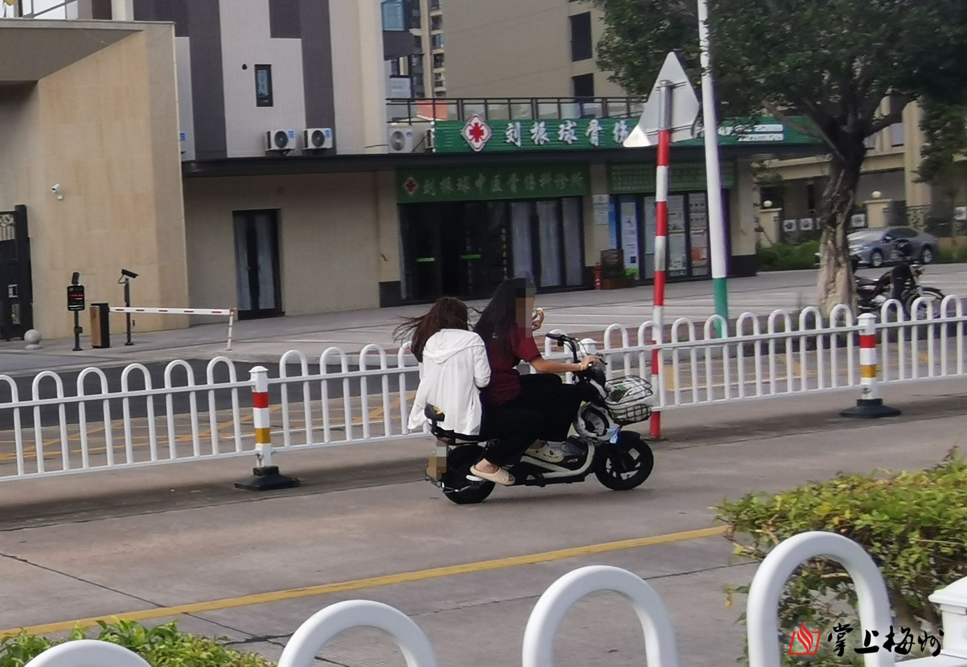 近日下午,记者在梅城秀兰大桥上看到,一名年轻女孩骑着电动自行车往嘉应东路方向前行,后座上还载着另一名女孩,两人均未戴头盔,且都手拿一支雪糕。桥面上车流较大,一辆辆小汽车、摩托车从她们身边快速驶过,而女孩单手把住车头,边吃雪糕边骑行,让人不禁替她们捏一把汗。
