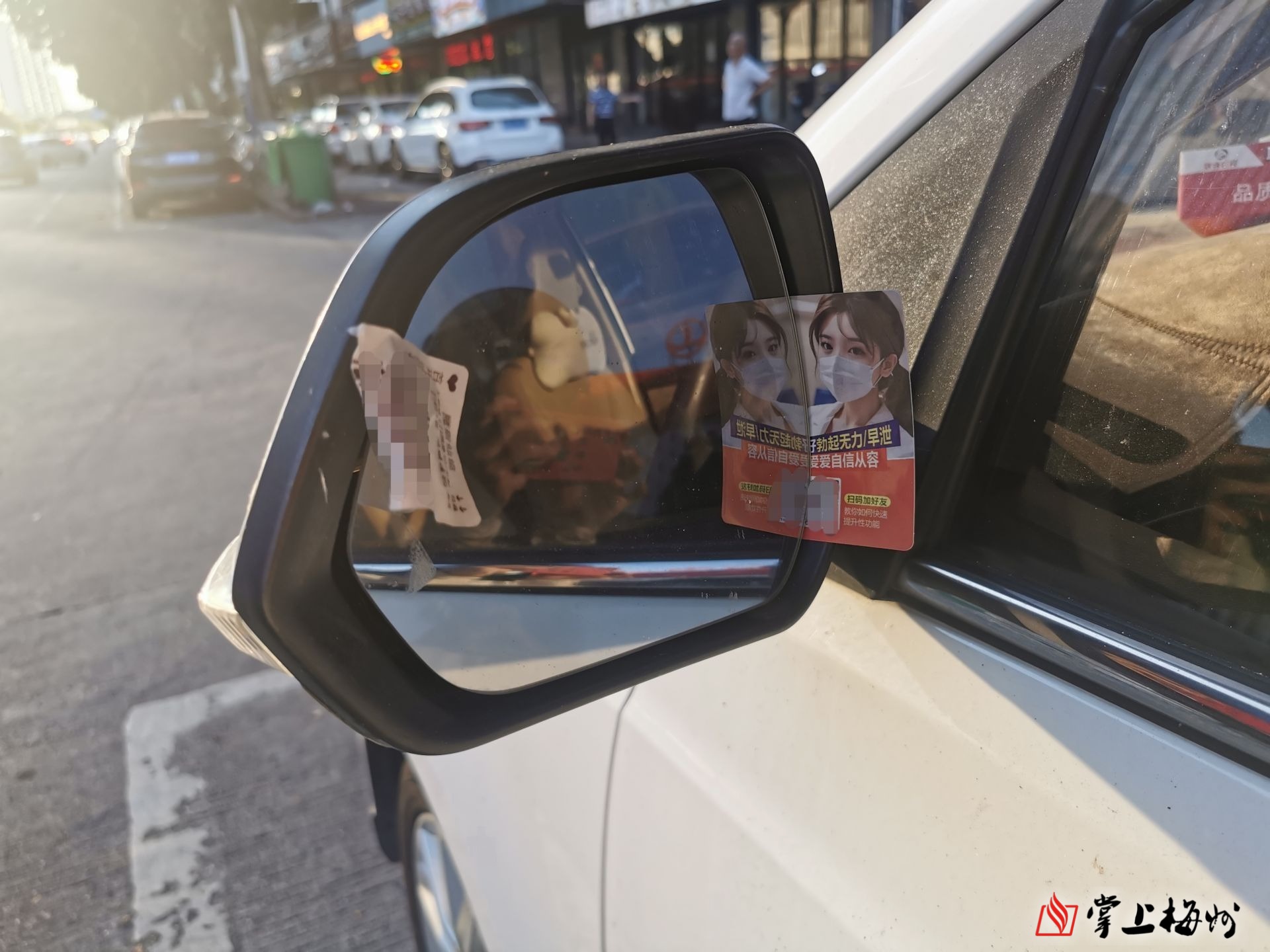 近日,市民廖女士前往梅城客都汇商业文化广场,其间将私家车停放在地下停车场中。准备离开时,廖女士发现车辆后视镜上被贴了一张便利贴。从其提供的照片中可看到,便利贴上印刷的是非法代孕广告,还附带有二维码。“便利贴粘得不牢固,被风一吹就飞走了。让我觉得不可思议的是,我锁了车之后,后视镜是折叠着的,他们竟然还坚持把小广告贴在镜片上。”廖女士说。