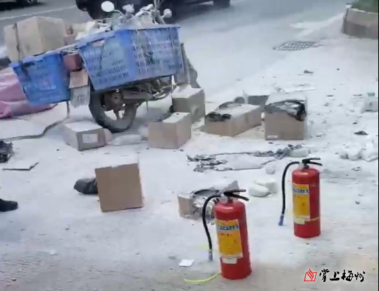 掌上梅州讯 7月24日上午11时许,艳阳高照。梅城环市西路梅州城西职业技术学校路段,一辆满载快递的摩托车停靠路边,快递小哥正忙着把冒烟着火的快递从车上卸下,心急如焚,显得非常无助。好在路过热心车主的及时帮忙,快递小哥的损失被降到最低。