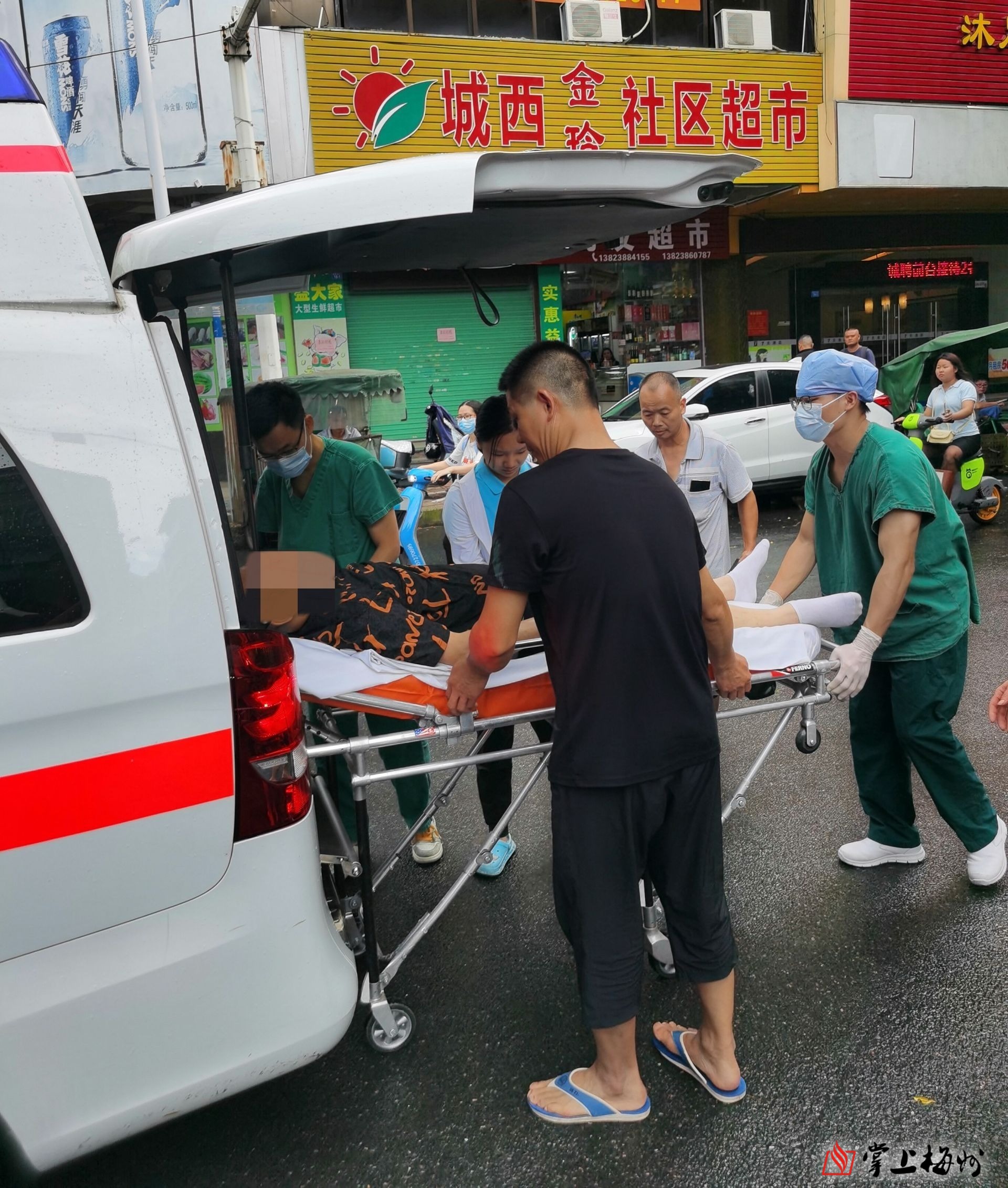 掌上梅州讯 7月27日下午,梅城一男子骑摩托车经过梅江区城西大道望杏坊路口时突发昏迷倒地,街坊邻居热心上前帮助男子,并拨打120救护车电话,合力将男子送上救护车。