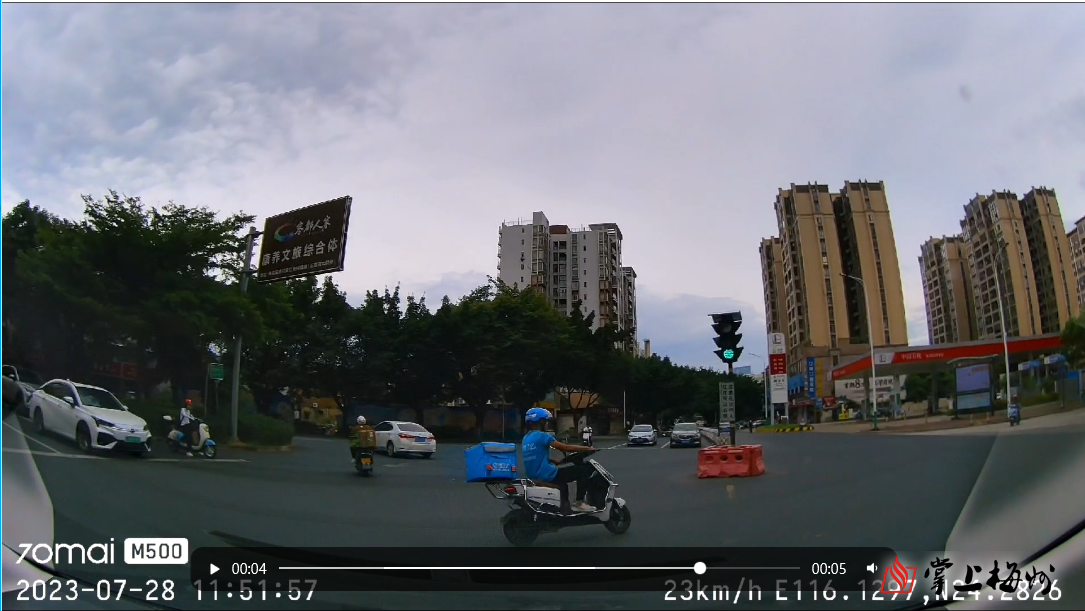 掌上梅州讯 如今的大街小巷总能看到外卖快递小哥忙碌的身影,他们佩戴头盔,统一着装,骑着电动车穿梭于城市每个角落。然而,为了赶时间,有些外卖员却置交通规则于不顾,甚至闯红灯、逆行……7月27日中午,市民陈先生行驶时就遇到一位外卖小哥闯红灯,差点与其相撞,十分惊险。