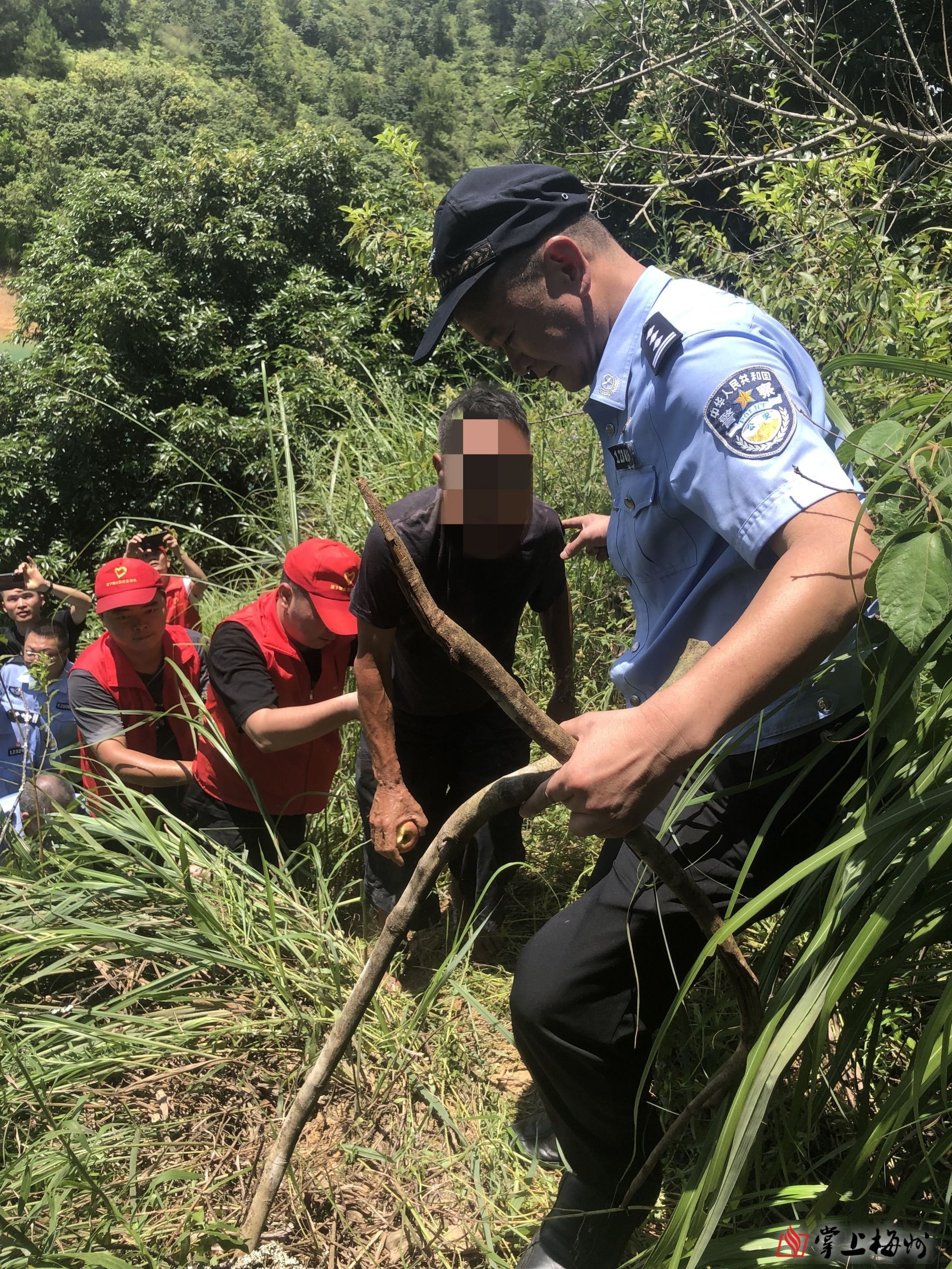 25日8时许,距离群众报警已经过去了23个小时。正当大家一筹莫展时,有位村民向周边走访调查的民警反映,其曾于24日晚间在万子村山上看到过钟大伯的身影。考虑到山林地形复杂,搜寻区域面积广,搜救队伍进一步扩大,刑侦大队联合潭下、转水、华城派出所警力以及当地村干部、五华县青年志愿突击队、热心村民和钟大伯家属等50余人奔赴万子村山上。一路上,搜寻队伍呼喊着钟大伯的名字,不断向山林深入搜寻。山上树木丛生、山地湿滑,给搜救工作带来了困难和危险。其间,搜救队伍发现了折断不久的树枝和一把扫帚,看到希望的民警立即据此分析研判老人走向,搜救队伍沿着扫帚和树枝周边100米再次展开地毯式搜寻。