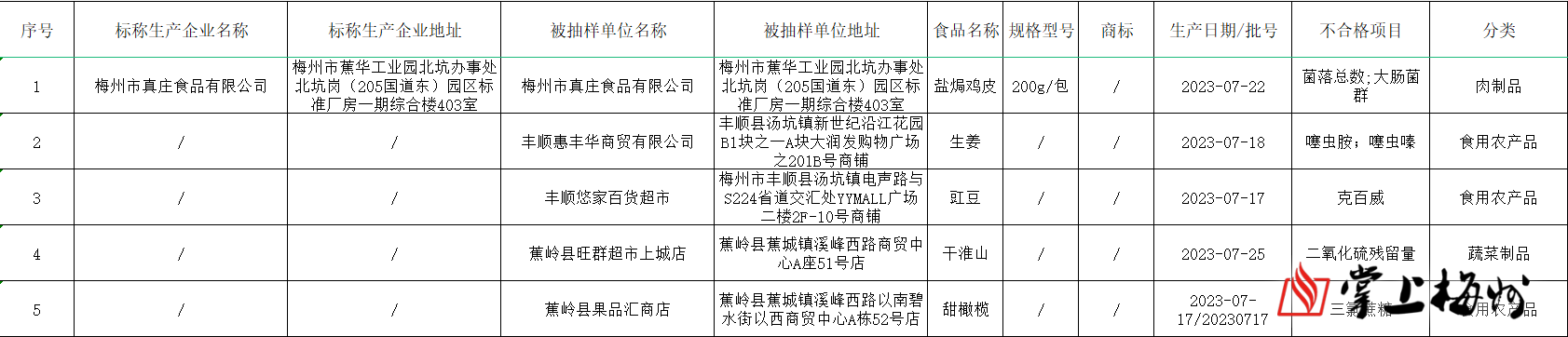 掌上梅州讯 日前,市市场监督管理局对2023年第三期食品抽检情况进行了公示,此次抽检了300批次食品样品,其中抽检样品不合格5批次。