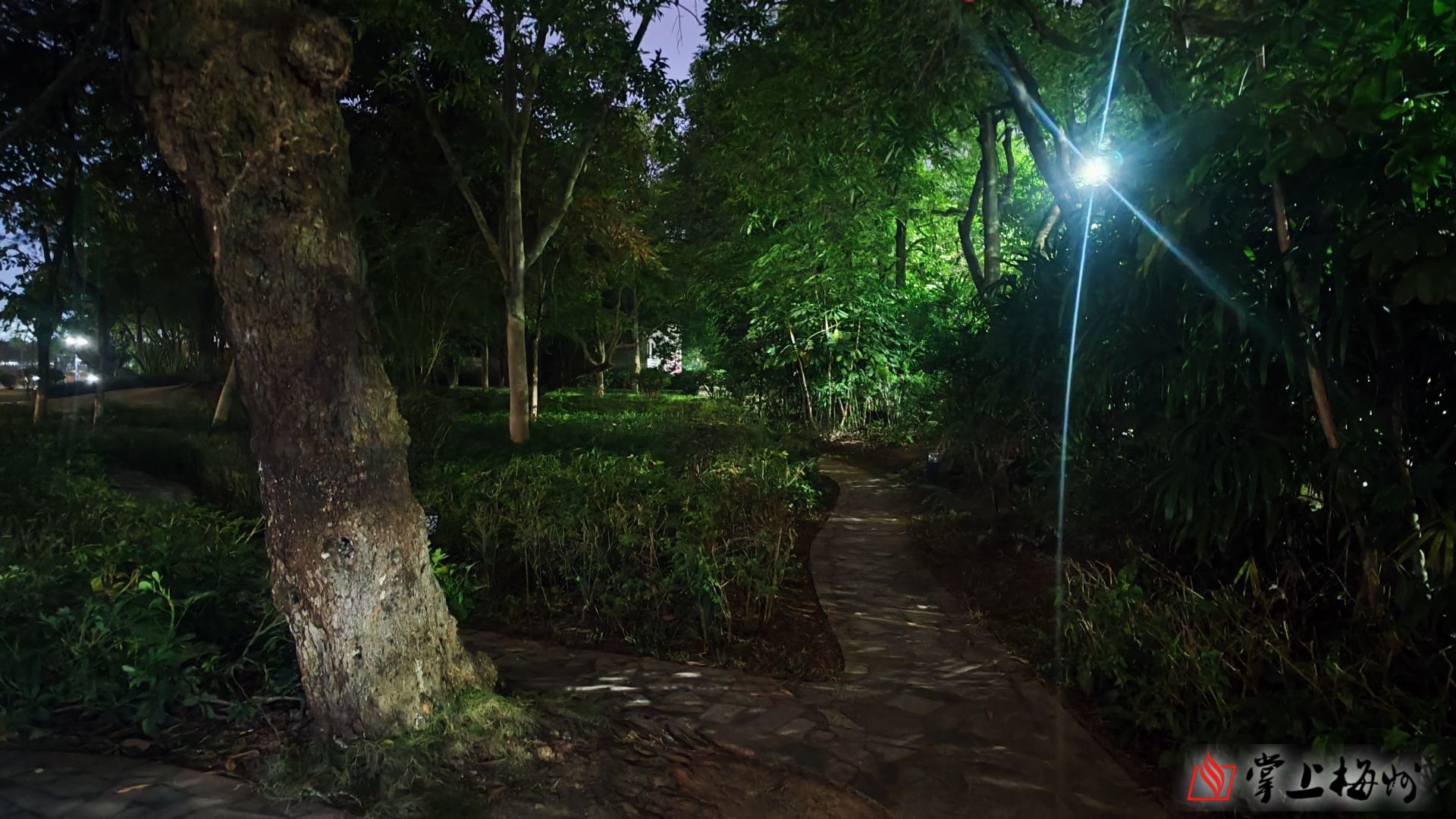 接到市民们的反映后,记者第一时间前往现场。当晚8时30分,记者从位于华南大道天桥侧的路口进入公园,发现公园内一条人行小路没有安装路灯,现场一片漆黑。记者沿着公园环湖道路绕行了一圈,发现公园路边安装有路灯,但路灯之间的间隔距离较远,而且有些灯光亮度不够,导致公园变得昏暗。
