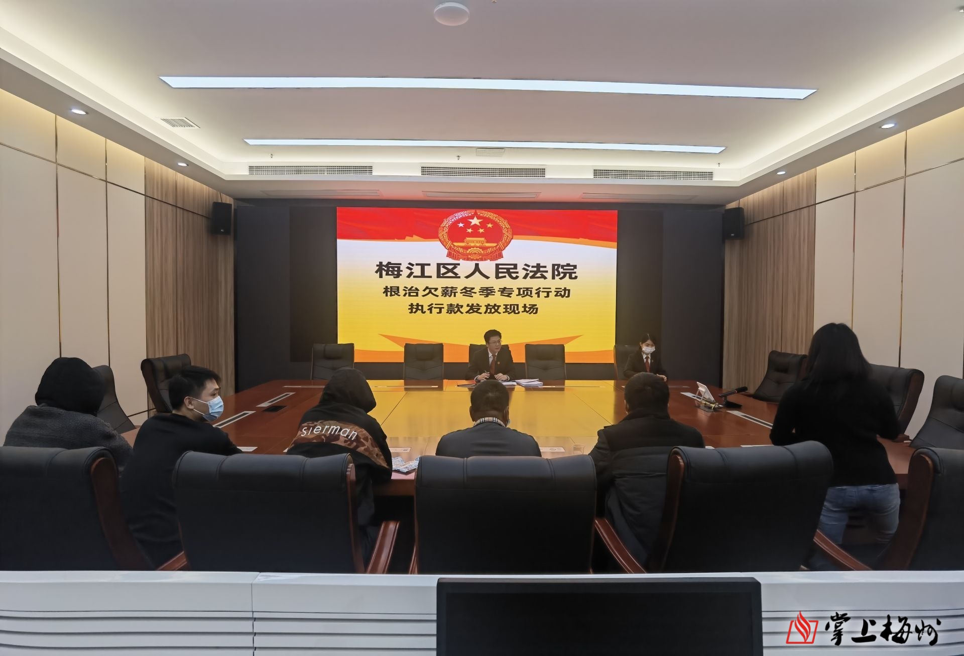 掌上梅州讯 “大家好,今日我院按照省、市法院开展根治欠薪冬季专项行动的部署,为各位集中发放被拖欠的工资,请逐一上前签收支票,领取各自支票后请到指定银行取款。”29日,在梅江区法院执行指挥中心,执行员的提示声、工人们的感谢声和欢笑声此起彼伏,驱散了冬日的寒气。梅江区法院执行局妥善执结某建筑公司拖欠工人工资系列案,让工人们在年前领到拖欠工资,帮助他们纾困解忧,获得现场工人们好评不断。