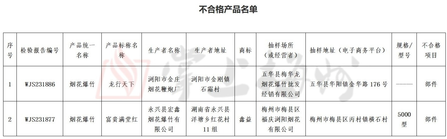 掌上梅州讯 临近岁末年初,为加强我市产品质量监督,保障生产安全和广大消费者生命财产安全,近期,梅州市市场监督管理局对烟花爆竹产品质量进行了监督抽查。抽查结果显示,在被抽查的16批次烟花爆竹产品中,有2批次烟花爆竹产品不合格。