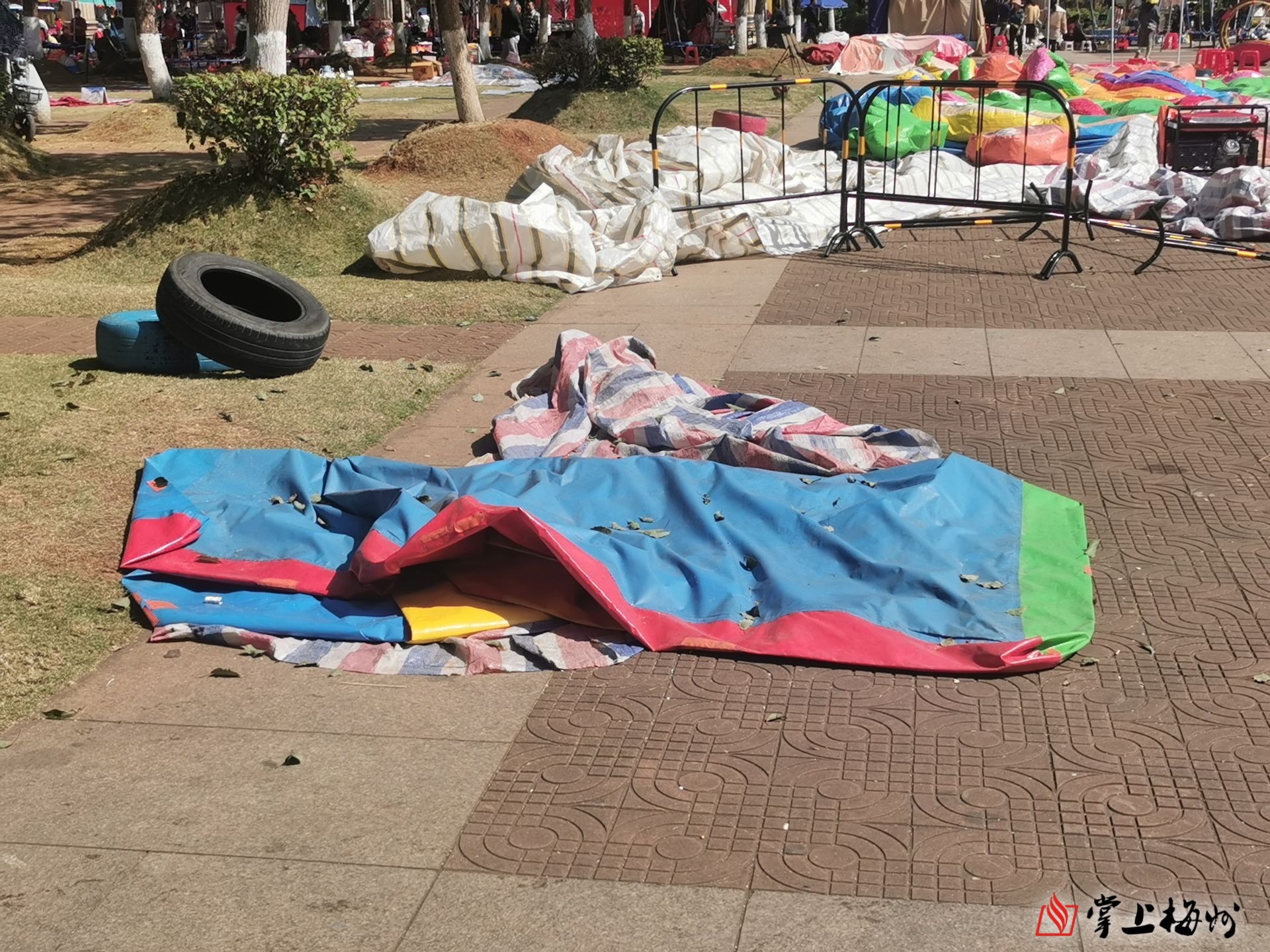 春节期间,记者在梅县区人民广场看到,不少流动摊贩或摆卖玩具、小吃等,或提供射击、套圈、蹦蹦床等游乐项目,吸引了许多家长携带孩子前来休闲玩耍,现场好不热闹。临近散场时,部分摊贩却将摆摊使用的围布等物品丢弃在原地,看起来稍显狼藉,还有一些市民游客将未吃完的糖葫芦等小吃随手扔在地上,既浪费也不卫生。在广场凉亭内,有几位市民手拿话筒,配合着音响设备放声高歌,声音盖过了现场不少欢声笑语。此外,广场内还出现安全隐患,有人将未熄灭的烟头直接丢弃在草坪上,还有几名小朋友在草坪附近玩小鞭炮。